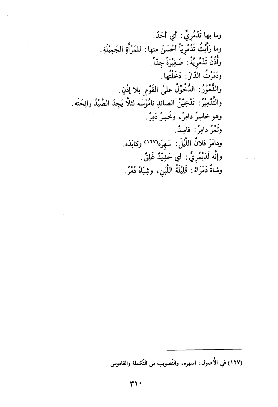 وما بها تَدْمُرِي : أي أحَدٌ . وما رَأيْتُ تَدْمُرِتاً أحْسَنَ منها : للمَرأةِ الجَمِيْلَةِ . وأذُنٌ تَدْمُرِيَّة : صَغِيْرَةٌ جِدّاً . ودَمَرْتُ الدّارَ : دَخَلْتُها . والدُّموْرُ : الدُخُوْلُ على القَوْم بلا إذْنٍ . والتدْمِيْرُ : تَدْخِيْنُ الصائدِ نامُوْسه لئلايَجِدَ الصَّيْدُ رائِحَتَه . وهو خاسِرٌ دامِرٌ ، وخَسِرٌ دَمِرٌ . وتَمْر دامِرٌ : فاسِد . ودامَرَ فلان اللَيْلَ : سَهِرَه وكابَدَه . وإنه لَدَيْمُرِي : أي حَدِيْدٌ غَلِقٌ . وشاةٌ دَمْرَاءُ : قَلِيْلَةُ اللَبَنِ ، وشِيَاة دُمْرٌ .