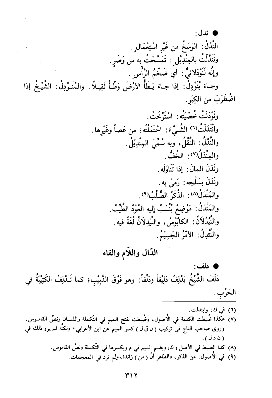 ندل النَدْلُ : الوَسَخُ من غَيْرِ اسْتِعْمَالٍ . وتَنَدَّلْتُ بالمِنْدِيْلِ : تَمَسحْتُ به من وَضَرٍ . وإنَّه لَنَوْدَلاني : أي ضَخْمُ الرأسِ . وجاءَ يُنَوْدِلُ : إذا جاءَ يَطَأ الأرْضَ وَطْأً ثَقِيلاً . والمُنَوْدِلُ : الشيْخُ إذا اضْطَرَبَ من الكِبَرِ . ونَوْدَلَتْ خُصْيَتُه : اسْتَرْخَتْ . وانْتَدَلْتُ الشيْءَ : احْتَمَلْتُه ؛ من عَصاً وغَيْرِها . والنَّدْلُ : النَّقْلُ ، وبه سُمِّيَ المِنْدِيْلُ . والمِنْدَلُ : الخُفُّ . ونَدَلَ المالَ : إذا تَنَاوَلَه . ونَدَلَ بسَلْحِه : رَمى به . والمَنْدَلُ : الذَكَرُ الصُّلْبُ . والمَنْدَلُ : مَوْضِعٌ يُنسَبُ إليه العُوْدُ الطَّيِّب . والنَيْدُلَانُ : الكابُوْسُ ، والنَيْدِلَانُ لُغَةٌ فيه . والنِّئْدِلُ : الأمْرُ الجَسِيْمُ .