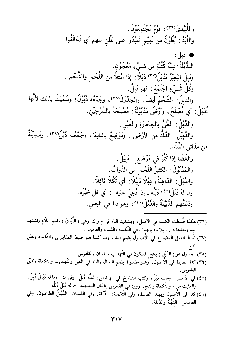 واللُبَيْدى : قَوْمٌ مُجْتَمِعُوْنَ . واللِّبَدُ : بُطُوْنٌ من تَمِيْمٍ تَلَبَّدُوا على بَطْنٍ منهم أي تَحَالَفُوا . ؟ دبل الدُبْلَةُ : شِبْهُ كُتْلَةٍ من شَيْءٍ مَعْجُوْنِ . ودَبِلَ البَعِيْرُ يَدْبَلُ دَبَلاً : إذا افتَلامن اللَّحْمِ والشَّحْمِ . وكُلُّ شَيْءٍ اجْتَمَعَ : فهو دَبِلٌ . والدَّبِلُ : الشَّحْمُ أيضاً . والجَدْوَلُ ، وجَمْعه دُبُوْلٌ ؛ وسُمِّيَتْ بذلك لأنَّها تُدْبَلُ : أي تُصْلَحُ ، وأرْضٌ مَدْبُوْلَةٌ : مُصْلَحَةٌ بالسِّرْجِيْنِ . والدَبْلُ : الطي بالحِجَارَةِ والطيْنِ . والدَبِيْلُ : الدُّكُّ من الأرْضِ . ومَوْضِعٌ بالبادِيَةِ ، وجَمْعُه دُبْلٌ . ومَدِيْنَةٌ من مَدَائن السِّنْدِ . والغَضَا إذا كَثُرَ في مَوْضِعٍ : دَبِيْلٌ . والمَدْبُوْلُ : الكثيرُ اللَّحْمِ من الدَّوَابِّ . والدِّبْلُ : الدّاهِيَةُ ، دِبْلاً دَبِيْلًا : أي ثُكْلاً ثاكِلاً . وما لَهُ دَبَلَ دَبْلُه - إذا دُعِيَ عليه - : أي قَل خَيْرُه . ودَبَلَتْهم الدُّبَيْلَةُ والدِّبْلُ : وهو داءٌ في البَطْنِ .