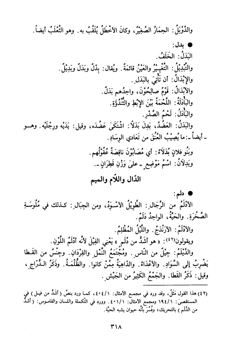 والدَوْبَلُ : الحِمَارُ الصغِيْرُ ، وكانَ الأخْطَلُ يُلَقَّبُ به . وهو الثَّعْلَبُ أيضاً . بدل البَدَلُ : الخَلَفُ . والتَبْدِيْلُ : التَّغْيِيْرُ والعَيْنُ قائمَةٌ . وُيقال : بِدْلٌ وبَدَلٌ وبَدِيْل . والإبْدَالُ : أن تَأتِيَ بالبَدَلَ . والأبْدَالُ : قَوْمٌ صالِحُوْنَ ، واحِدُهم بَدَلٌ . والبَأدَلَةُ : اللَحْمَةُ بَيْنَ الإبْطِ والثُنْدُؤَةِ . والبَأدَل : لَحْمُ الصَّدْرِ . والبَدَلُ : العَضُدُ ، بَدِلَ بَدَلاً : اشْتَكَى عَضُدَه ، وقيل : يَدَيْه ورِجْلَيْه . وهو - أيضاً - : ما يُصِيْبُ العُنُقَ من تَعَادي الوِسَادِ . وبَنُو فلانٍ بُدَلاءُ : أي مُصَابُوْنَ ناقِصَةٌ عُقُوْلُهم . وبَدِلانُ : اسْمُ مَوْضِعٍ - على وَزْنِ قَطِرَانٍ - .