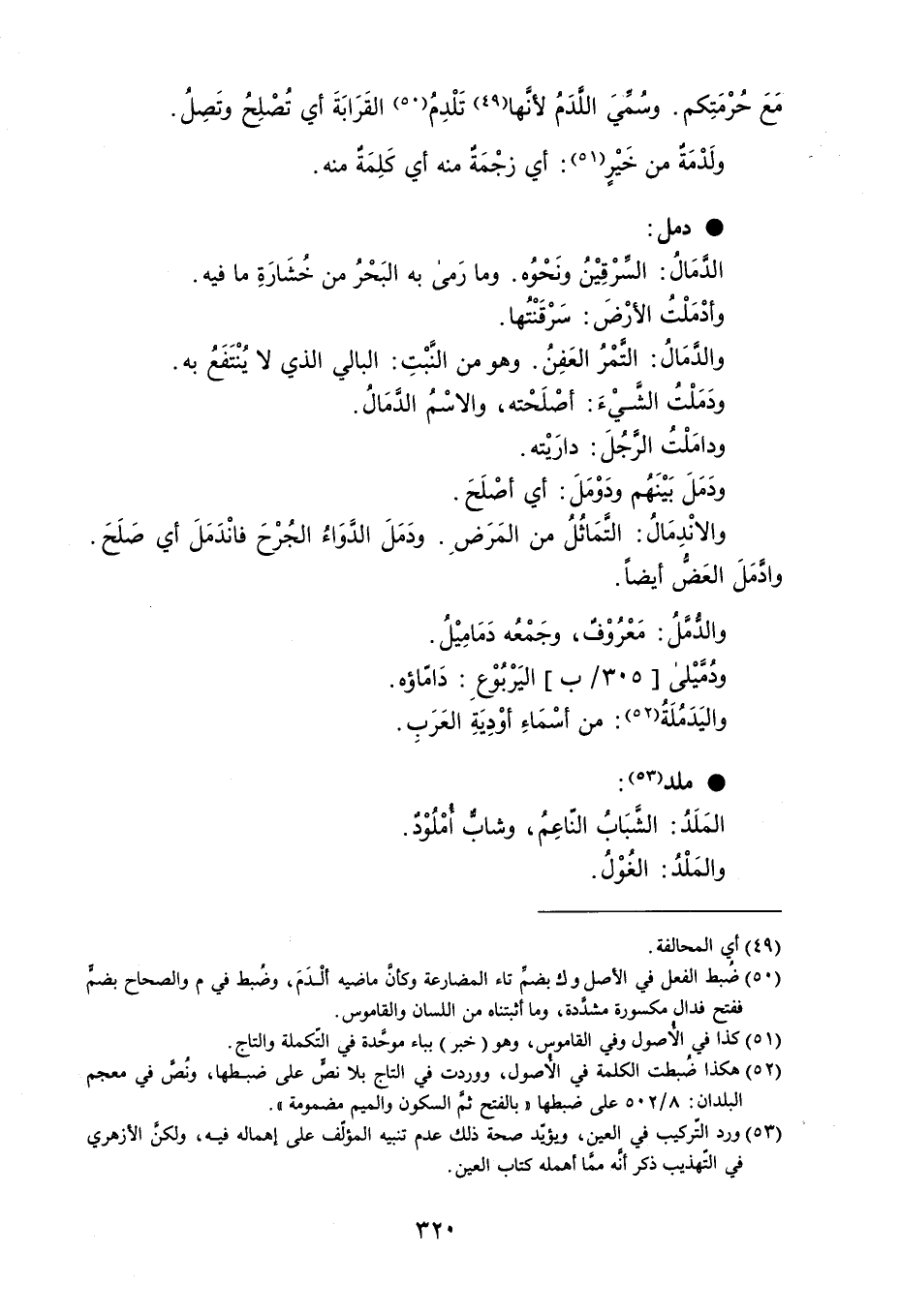 مَعَ حُرْمَتِكم . وسُميَ اللَّدَمُ لأنَّها تَلْدِمُ القَرَابَةَ أي تصْلِحُ وتَصِل . ولَدْمَةٌ من خَيْرٍ : أي زجْمَةٌ منه أي كَلِمَةٌ منه . دمل الدَّمَالُ : السرْقِيْنُ ونَحْوُه . وما رَمى به البَحْرُ من خُشَارَةِ ما فيه . وأدْمَلْتُ الأرْضَ : سرْقَنْتُها . والدَّمَالُ : التَّمْرُ العَفِنُ . وهو من النَّبْتِ : البالي الذي لا ينْتَفَعُ به . ودَمَلْتُ الشَّيْءَ : أصْلَحْته ، والاسْمُ الدَّمَالُ . ودامَلْتُ الرَّجُلَ : دارَيْته . ودَمَلَ بَيْنَهُم ودَوْمَلَ : أي أصْلَحَ . والانْدِمَالُ : التَّمَاثُلُ من المَرَضِ . ودَمَلَ الدَّوَاءُ الجُرْحَ فانْدَمَلَ أي صَلَحَ . وادَمَلَ العَضُّ أيضاً . والدُمَلُ : مَعْرُوْفٌ ، وجَمْعُه دَمَامِيْل . ودُمَيْلى اليَرْبُوْعِ : دَامّاؤه . واليَدَمُلَةُ : من أسْمَاءِ أوْدِيَةِ العَرَبِ . ملد المَلَدُ : الشَّبَابُ النّاعِمُ ، وشاب أمْلوْدٌ . والمَلْدُ : الغُوْلُ .