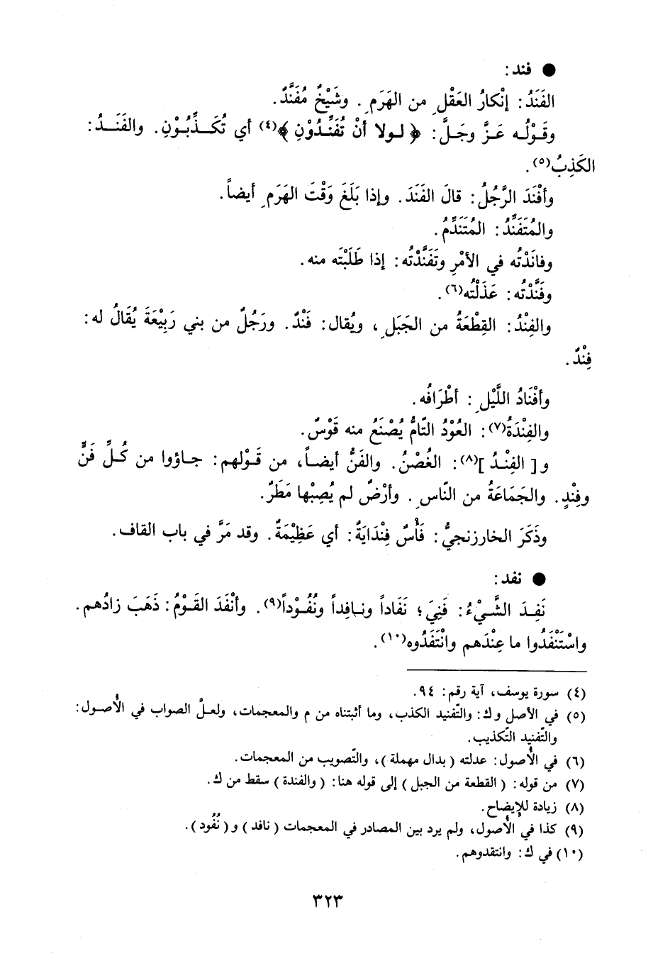 فند الفَنَدُ : إنْكارُ العَقْلِ من الهَرَمِ . وشَيْخ مُفَندٌ . وقَوْلُه عَزٌ وجَلَّ : ' لولا أنْ تُفَنِّدُوْنِ ' أي تُكَذِّبُوْنِ . والفَنَدُ : الكَذِبُ . وأفْنَدَ الرجُلُ : قالَ الفَنَدَ . وإذا بَلَغَ وَقْتَ الهَرَمِ أيضاً . والمُتَفَنِّدُ : المُتَنَدِّمُ . وفانَدْتُه في الأمْرِ وتَفَنَدْتُه : إذا طَلَبْتَه منه . وفَنَّدْتُه : عَذَلْتُه . والفِنْدُ : القِطْعَة من الجَبَلِ ، وُيقال : فَنْدٌ . ورَجُلٌ من بني رَبِيْعَةَ يُقَالُ له : فِنْدٌ . وأفْنَادُ اللَيْلِ : أطْرَافُه . والفِنْدَةُ : العُوْدُ التّامُ يُصْنَعُ منه قَوْسٌ . والفِنْدُ : الغُصْنُ . والفَنُّ أيضاً ، من قَوْلهم : جاؤوا من كُلِّ فَنّ وفِنْدٍ . والجَمَاعَةُ من النّاسِ . وأرْضٌ لم يُصِبْها مَطَرٌ . وذَكَرَ الخارزنجيُّ : فَأسٌ فِنْدَايَة : أي عَظِيْمَةٌ . وقد مَرَّ في باب القاف . نفد نَفِدَ الشيْءُ : فَنِيَ ؛ نَفَاداً ونافِداً ونُفُوْداً . وأنْفَدَ القَوْمُ : ذَهَبَ زادُهم . واسْتَنْفَدُوا ما عِنْدَهم وانْتَفَدُوه .