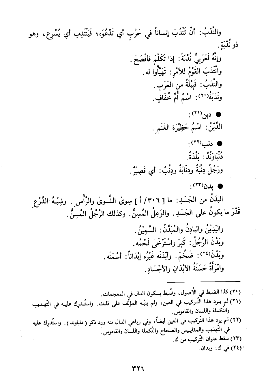 والنَدْبُ : أنْ تَنْدُبَ إنساناً في حَرْبِ أي تَدْعُوَه ؛ فَيَنْتَدِب أي يُسْرع ، وهو ذو نُدْبَةٍ . وإنَهُ لَعَرَبِيُّ نُدْبَةً : إذا تَكَلَمَ فأفْصَحَ . وانْتَدَبَ القَوْمُ للأمْرِ : تَهَيَّاوا له . والنَّدَبُ : قَبِيْلَة من العَرَبِ . ونَدَبَةُ : اسْمُ أمَ خُفَافٍ . دبن الدٌبْنُ : اسْمُ حَظِيْرَةِ الغَنَمِ . دنب دُنْبَاوَنْدُ : بَلْدَةٌ . ورَجُل دِنَّبَةٌ ودِنابَةٌ ودِنَبٌ : أي قَصِيْرٌ . بدن البَدَنُ من الجَسَدِ : ما سِوى الشوى والرَّأسِ . وشِبْهُ الدِّرْعِ قَدْرَ ما يكونُ على الجَسَدِ . والوَعِلُ المُسِن . وكذلك الرجُلُ المُسِنُّ . والبَدِيْنُ والبادِنُ والمُبَدَّنُ : السَّمِيْنُ . وبَدَنَ الرجُلُ : كَبِرَ واسْتَرْخَى لَحْمُه . وبَدُنَ : ضَخُمَ . وأبْدَنَه غَيْرُه إبْدَاناً : أسْمَنَه . وامْرأةٌ حَسَنَةُ الأبْدَانِ والأجْسَادِ .