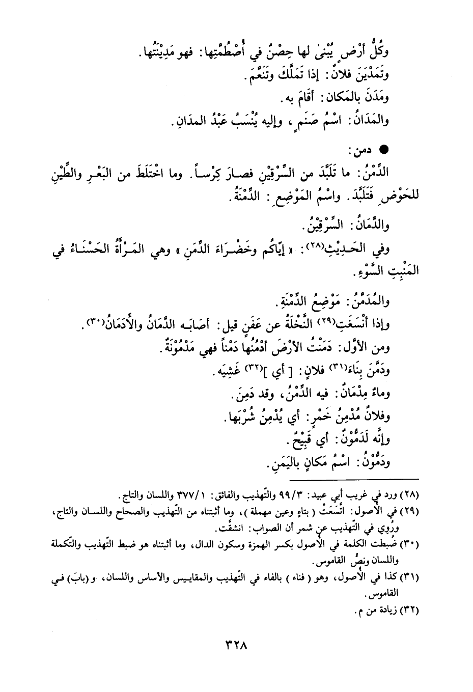 وكُلُّ أرْضٍ يُبْنى لها حِصْن في أصْطمَّتِها : فهومَدِيْنَتُها . وتَمَدْيَنَ فلانٌ : إذا تَمَلَكَ وتَنَعَّمَ . ومَدَنَ بالمَكان : أقَامَ به . والمَدَانُ : اسْمُ صَنَمٍ ، وإليه يُنْسَبُ عَبْدُ المدَانِ . دمن الدَمْنُ : ما تَلَبَّدَ من السرْقِيْنِ فصارَ كِرْساً . وما اخْتَلَطَ من البَعْرِ والطَيْنِ للحَوْضِ فَتَلَبدَ . واسْمُ المَوْضِعِ : الدِّمْنَةُ . والدَمَانُ : السرْقِيْنُ . وفي الحَدِيْثِ : ' إياكُم وخَضْرَاءَ الدِّمَنِ ' وهي المَرأةُ الحَسْنَاءُ في المَنْبِتِ السوْءِ . والمُدَمَّنُ : مَوْضِعُ الدَمْنَةِ . وإذا أنْسَغَتِ النَخْلَةُ عن عَفَنٍ قيل : أصَابَه الدَّمَانُ والأدَمَانُ . ومن الأول : دَمَنْتُ الأرْضَ أدْمُنُها دَمْناً فهي مَدْمُوْنَة . ودَفَنَ بِنَاءَ فلانٍ : أي غَشِيَه . وماءٌ مِدْمَانٌ : فيه الدَمْنُ ، وقد دَمِنَ . وفلانُ مُدْمِنُ خَمْرٍ : أي يُدْمِنُ شُرْبَها . وإنَه لَدَمُوْن : أي قَبِيْحٌ . ودَمُوْنُ : اسْمُ مَكانٍ باليَمن .