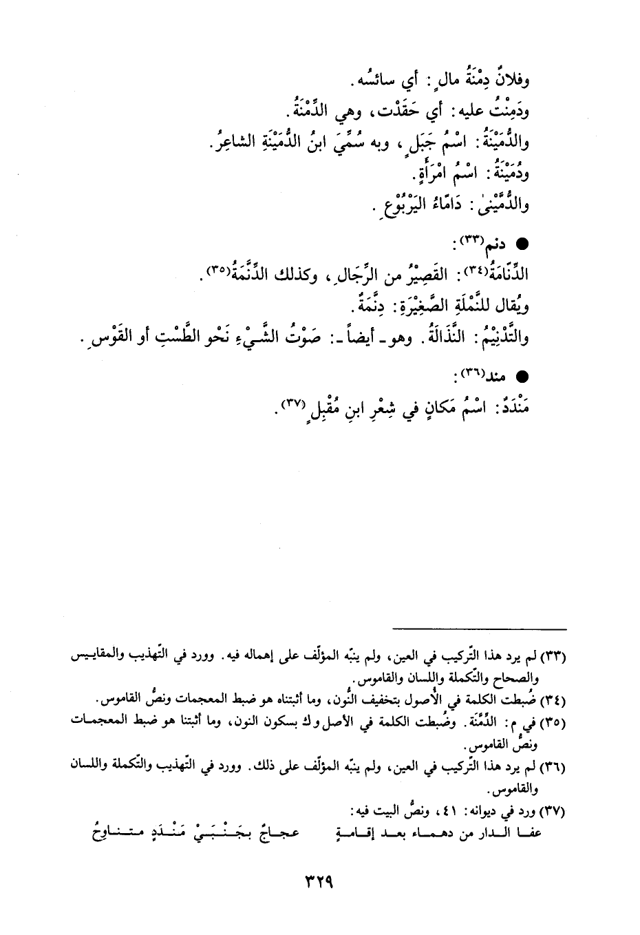 وفلانٌ دِمْنَةُ مالٍ : أي سائسه . ودَمِنْتُ عليه : أي حَقَدْت ، وهي الدِّمْنَةُ . والدُمَيْنَةُ : اسْمُ جَبَلٍ ، وبه سُمِّيَ ابن الدُّمَيْنَةِ الشاعِرُ . ودُمَيْنَةُ : اسْمُ امْرأةٍ . والدُمَيْنى : دَاماءُ اليَرْبُوْعِ . دنم الدِّنّامَة : القَصِيْرُ من الرجَالِ ، وكذلك الدنمَةُ . وُيقال للنَمْلَةِ الصغِيْرَةِ : دِنَّمَة . والتَّدْنِيْمُ : النَذَالَةُ . وهو - أيضاً - : صَوْتُ الشَّيْءِ نَحْو الطَّسْتِ أو القَوْسِ . مند مَنْدَدٌ : اسْمُ مكانٍ في شِعْرِ ابنِ مُقْبِلٍ .