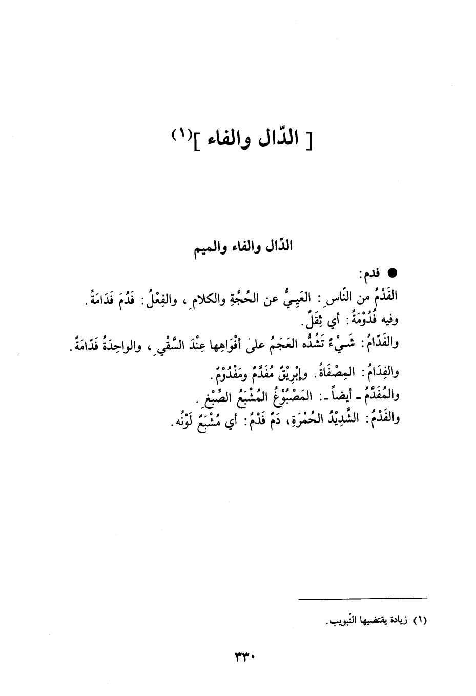 فدم الفَدْمُ من الناسِ : العَيِيُّ عن الحُجَّةِ والكلامِ ، والفِعْلُ : فَدُمَ فَدَامَةً . وفيه فُدُوْمَةٌ : أي ثِقَل . والفَدامُ : شَيْءٌ تَشُدُّه العَجَمُ على أفْوَاهِها عِنْدَ السَّقْيِ ، والواحِدَةُ فَدامَة . والفِدَامُ : المِصْفَاةُ . وإبْرِيْقٌ مُفَدَّم ومَفْدُوْمٌ . والمُفَدَمُ - أيضاً - : المَصْبُوْغُ المُشْبَعُ الصِّبْغِ . والفَدْمُ : الشَّدِيْدُ الحُمْرَةِ ، دَمٌ فَدْمٌ : أي مُشْبَغ لَوْنُه .