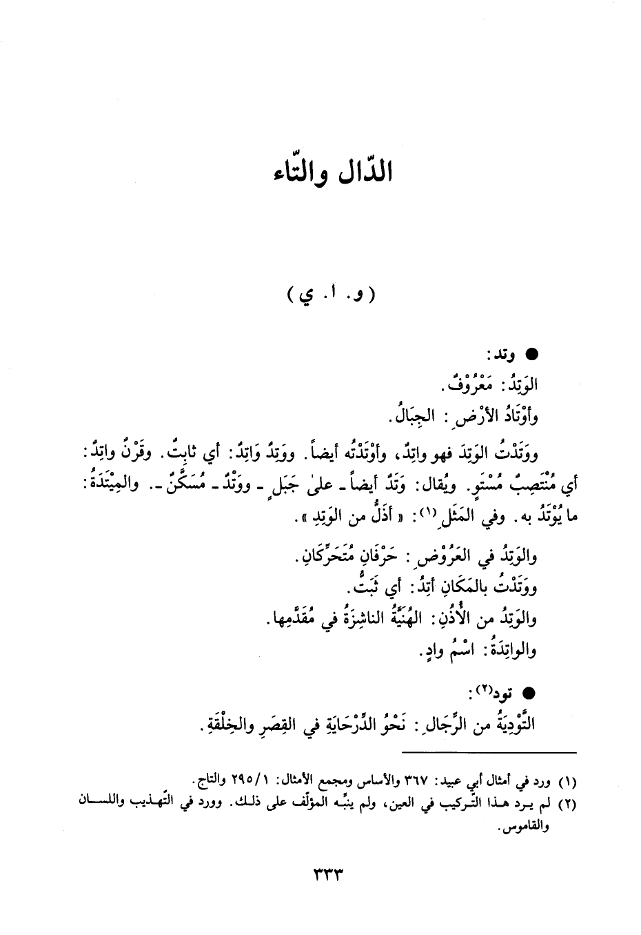 وتد الوَتِدُ : مَعْرُوْفٌ . وأوْتَادُ الأرْضِ : الجِبَالُ . ووَتَدْت الوَتِدَ فهو واتِد ، وأوْتَدْته أيضاً . ووتد وَاتِد : أي ثابت . وقَرْن واتِد : أي مُنْتَصِب مُسْتَوٍ . وُيقال : وَتَدٌ أيضاً - على جَبَلٍ - ووَتْدٌ - مُسَكًّنٌ - . والمِيْتَدَةُ : ما يُؤتَدُ به . وفي المَثَلِ : ' أذَلُ من الوَتِدِ ' . والوَتِدُ في العَرُوْضِ : حَرْفَانِ مُتَحَركَانِ . ووَتَدْتُ بالمَكَانِ أتِدُ : أي ثَبَتّ . والوَتِدُ من الأذُنِ : الهُنَيةُ الناشِزة في مُقَدمِها . والواتِدَةُ : اسْمُ وادٍ . تود التوْدِيَة من الرجَالِ : نَحْوُ الدَرْحَايَةِ في القِصَرِ والخِلْقَةِ .