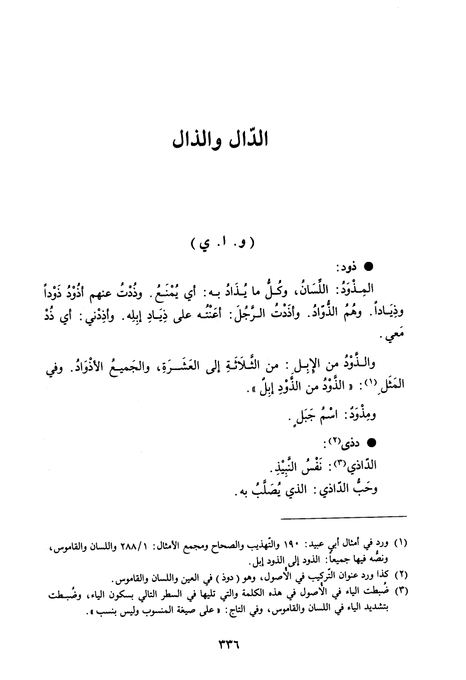 ذود المِذْوَدُ : اللَسَانُ ، وكُلُّ ما يُذَادُ به : أي يُمْنَع . وذُدْتُ عنهم أذُوْذ ذَوْداً وِذِيَاداً . وهمُ الذُّوّادُ . وأذَدْتُ الرجُلَ : أعَنْتُه على ذِيَادِ إبِلِه . وأذِدْني : أي ذُدْ معي . والذوْدُ من الإبِلِ : من الثَّلاَثَةِ إلى العَشَرَةِ ، والجَميعُ الأذْوَادُ . وفي المَثَلِ : ' الذَّوْدُ من الذَوْدِ إبِل ' . ومِذْوَدٌ : اسْمُ جَبَل . دذى الدّاذي : نَفْس النَبِيْذِ . وحَبُّ الدّاذي : الذي يُصَلبُ به . الدّال