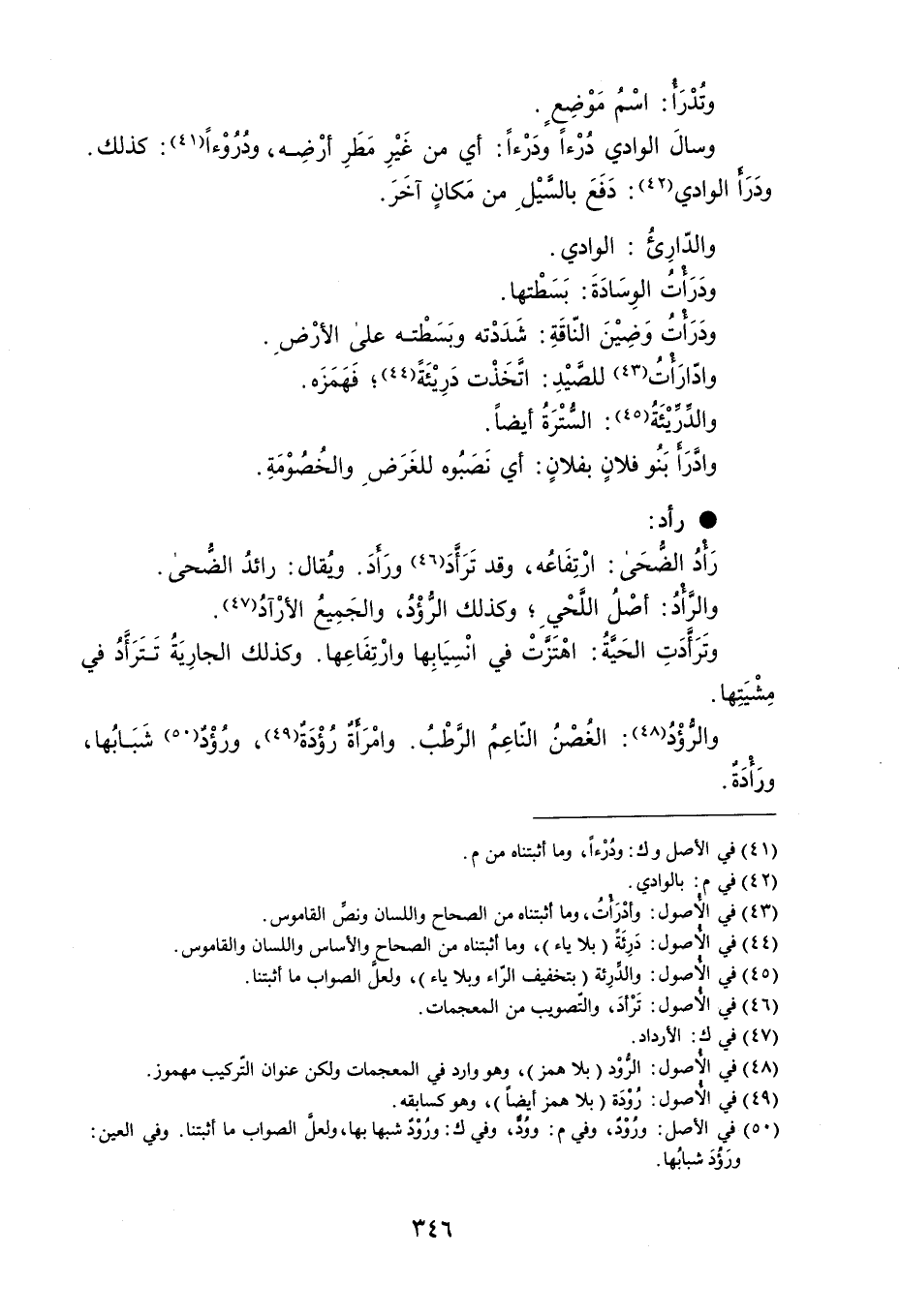 وتُدْرَأ : اسْمُ مَوْضِعٍِ . وسالَ الوادي دُرْءاَ ودَرْءاً : أي من غَيْرِ مَطَرِ أرْضِه ، ودرُوءْاً : كذلك . ودَرَأ الوادي : دَفَعَ بالسَّيْلِ من مَكانٍ آخَرَ . والدّارِئُ : الوادي . ودَرَأْتُ الوِسَادَةَ : بَسَطْتها . ودَرَأت وَضِيْنَ النّاقَةِ : شَدَدْته وبَسَطْته على الأرْضِ . وادّارَأتُ للصَّيْدِ : اتَّخَذْت دَرِيْئَةً ؛ فَهَمَزَه . والدَّريْئَةُ : السُّتْرَةُ أيضاً . وادَّرَأ بَنُو فلانٍ بفلانٍ : أي نَصَبُوه للغَرَضِ والخُصُوْمَةِ . رأد رَأد الضُحَى : ارْتِفَاعُه ، وقد تَرَأَّدَ ورَأدَ . وُيقال : رائد الضُّحى . والرأدُ : أصْلُ اللَحْيِ ؛ وكذلك الرُّؤْدُ ، والجَمِيعُ الأرْآدُ . وتَرَأَّدَتِ الحَيَّةُ : اهْتَزَتْ في انْسِيَابِها وارْتِفَاعِها . وكذلك الجارِيَةُ تَتَرَأدُ في مِشْيَتِها . والرُّؤْدُ : الغُصْنُ النّاعِمُ الرَّطْبُ . وامْرأةٌ رُؤْدَةٌ ، ورُؤْد شَبَابُها ، ورأدة .