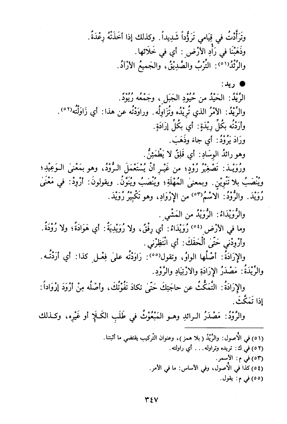وتَرَأدْتُ في قِيَامي تَرَؤُّداً شَدِيداً . وكذلك إذا أخَذَتْهُ رِعْدَةٌ . وذَهَبْنَا في رَأدِ الأرْض : أي في خَلاَئها . والرئْدُ : التَرْبُ والصَدِيْقُ ، والجَميعُ الأرْآدُ . ريد الريْدُ : الحَيْدُ من حُيُوْدِ الجَبَلِ ، وجَمْعُه رُيُوْدٌ . والرِّيْدُ : الأمْرُ الذي تُرِيْدُه وتُزَاوِلُه . وراوَدْتُه عن هذا : أي زَاوَلْتُه . وأرَدْتُه بكُل رِيْدَةٍ : أي بكُلِّ إرَادَةٍ . ورَادَ يَرُوْدُ : أي جاءَ وذَهَبَ . وهو رائدُ الوِسَادِ : أي قَلِقٌ لا يَطْمَئِنُّ . ورُوَيْدَ : تَصغير رُوْد ؛ من غَيْرِ أنْ يُسْتَعْمَلَ الرُّوْدُ ، وهو بمَعْنى الوَعِيْدِ ؛ وُينْصَبُ بلا تَنْوِيْنٍ . وبمعنى المُهْلَةِ ؛ وُينْصَبُ وُينَوَنُ . ويقولونَ : أرْوِدْ : في مَعْنَى رُوَيْدَ . والرُّوْدُ : الاسْمُ من الِإرْوَادِ ، وَهو تَكْبِيْرُ رُوَيْدَ . والرُّويدَاءُ : الرُوَيْدُ من المَشْيِ . وما في الأرْضِ رُوَيْدَاءُ : أي رِفْقٌ ، ولا رُويدِيَةٌ : أي هَوَادَةٌ ؛ ولا رُوْدَةٌ . وأرْوِدْني حَتّى ألْحَقَكَ : أي انْتَظِرْني . والِإرَادَةُ : أصْلُها الواوُ ، وتقول : رَاوَدْتُه على فِعْلِ كذا : أي أرَدْتُه . والريْدَةُ : مَصْدَرُ الإرَادَةِ والارْتِيَادِ والرَّوْدِ . والإِرَادَةُ : التَّمَكُثُ عن حاجَتِكَ حَتّى تكادَ تَفُوْتُكَ ، وأصلُه مِنْ أرْوَدَ إرْوَاداً : إذا تَمَكَّثَ . والرَّوْدُ : مَصْدَرُ الرائدِ وهو المَبْعُوْثُ في طَلَبِ الكَلاأو غَيْرِه ، وكذلك