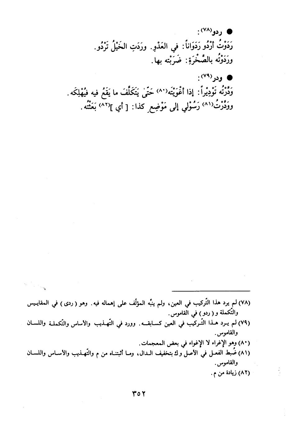 ردو : رَدَوْتُ أرْدُو رَدَوَاناً : في العَدْوِ . ورَدَتِ الخَيْلُ تَرْدُو . ورَدَوْتُه بالصَخْرَةِ : ضَرَبْته بها . ودر وَدَرْته تَوْدِيْراً اذا أغْوَيْتَه حَتى يَتَكَلَفَ ما يَقَع فيه فيُهْلِكَه . ووَدرْت رَسوْلي إلى مَوْضِعِ كذا أي بَعَثْتُه .