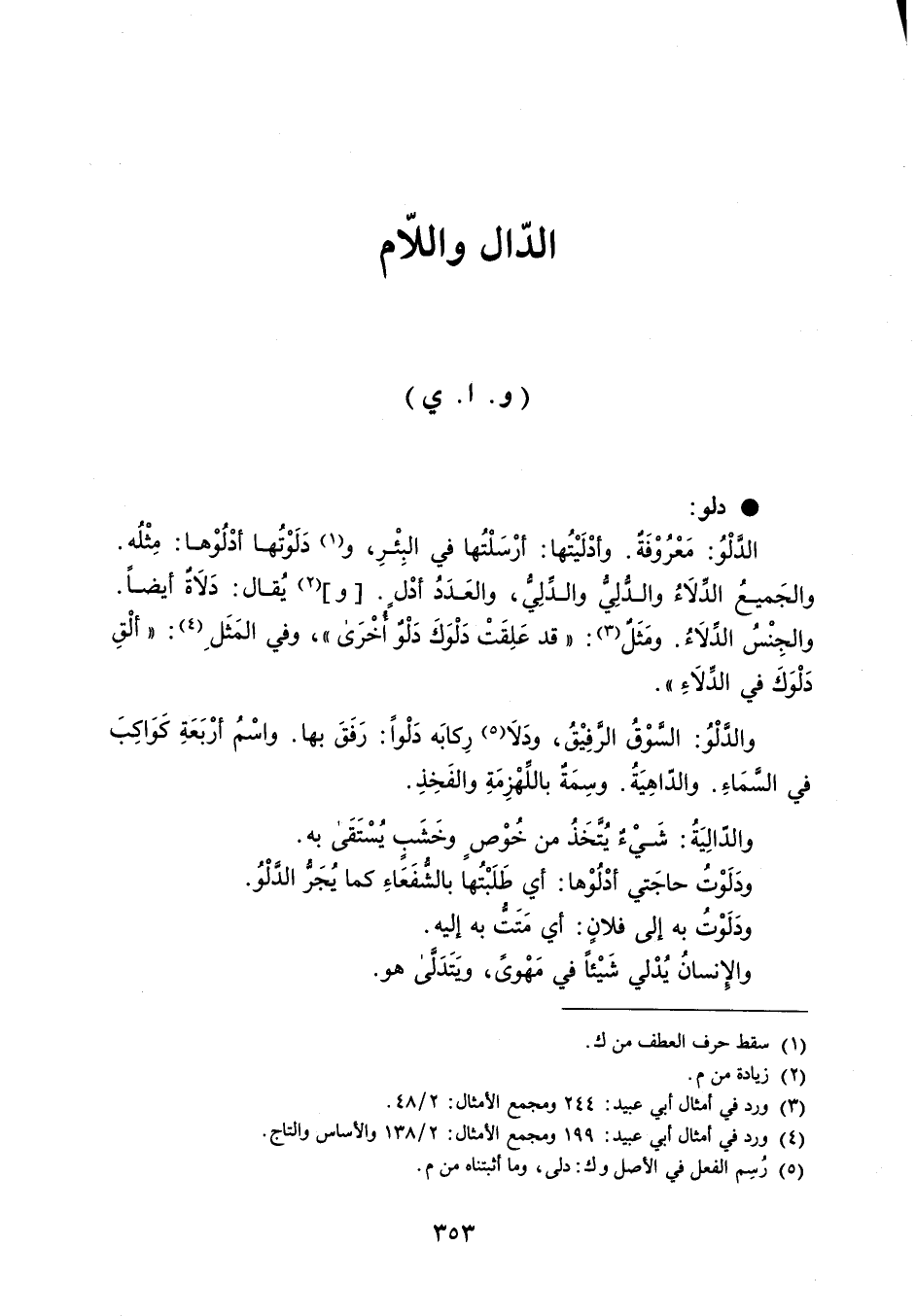 دلو الدَلْوُ : مَعْرُوْفَةٌ . وأدْلَيْتُها : أرْسَلْتُها في البِئْرِ ، ودَلَوْتُها أدْلُوْها : مِثْلُه . والجَميعُ الدَلَاءُ والدُّلِيُّ والدِّلِيُّ ، والعَدَدُ أدْلٍ و يُقال : دَلَاةٌ أيضاً . والجِنْسُ الدَلَاء ' . ومَثَلٌ : ' قد عَلِقَتْ دَلْوَكَ دَلْوٌ اخْرَى ' ، وفي المَثَلِ : ' ألْقِ دَلْوَكَ في الدَلَاءِ ' . والدَلْوُ : السَّوْقُ الرَّفِيْقُ ، ودَلارِكابَه دَلْواً : رَفَقَ بها . واسْمُ أرْبَعَةِ كَوَاكِبَ في السَّمَاءِ . والدّاهِيَةُ . وسِمَةٌ باللِّهْزِمَةِ والفَخِذِ . والدّالِيَةُ : شَيْءٌ يُتَّخَذُ من خُوْص وخَشَب يُسْتَقَى به . ودَلَوْتُ حاجَتي أدْلُوْها : أي طَلَبْتُها بالشُّفَعاءِ كما يُجَرُّ الدَّلْوُ . ودَلَوْتُ به إلى فلانٍ : أي مَتَتُّ به إليه . والإِنسانُ يُدْلي شَيْئاً في مَهْوىً ، وَيتَدَلى هو .