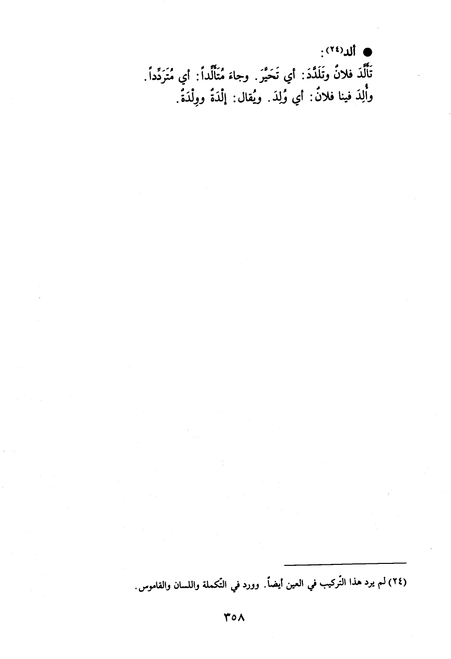 ألد : تَألدَ فلانٌ وتَلَددَ : أي تَحَيرَ . وجاءَ مُتَالداً : أي مُتَرَدِّداً . وألِدَ فينا فلان : أي وُلدَ . ويُقال : إلْدَةٌ ووِلْدَةٌ .