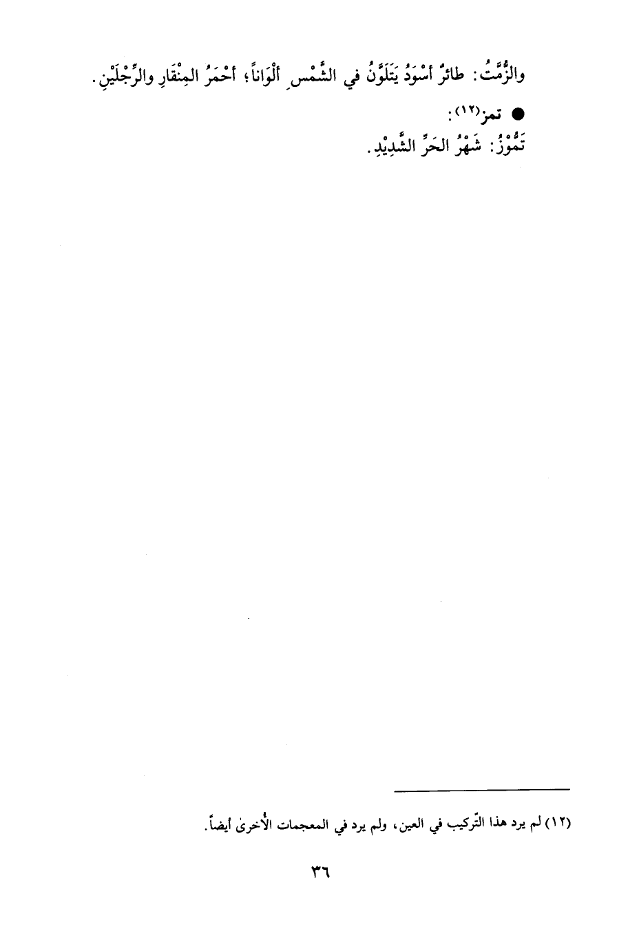 والزُمتُ : طائرٌ أسْوَدُ يَتَلَوَنُ في الشَّمْسِ ألْوَاناً ؛ أحْمَرُ المِنْقَارِ والرًجْلَيْنِ . تمز تَفًوْزُ : شَهْرُ الحَرِّ الشَّدِيْدِ .