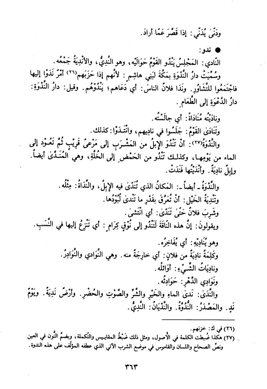ودَنى يدَني : إذا قَصّرَ عَمّا أرادَ . ندو النادي : المَجْلِسُ يَنْدُو القَوْمُ حَوَالَيْه ، وهو النَدِيُّ ، والأنْدِيَةُ جَمْعُه . وسُميَتْ دارُ الندْوَةِ بمَكَّةَ لبَنِي هاشِمٍ : لأنَّهم إذا حَزَبَهم أمْرٌ نَدَوْا إليها فاجْتَمَعُوا للتشَاوُرِ . ونَدَا فلانٌ الناسَ : أي دَعَاهم ؛ يَنْدُوْهُم . وقيل : دارُ الندْوَةِ : دارُ الدعْوَةِ إلى الطعَامِ . ونادَيْتُه مُنَادَاةً : أي جالَسْتُه . وتَنَادَى القَوْمُ : جَلَسُوا في نادِيهم ، وانْتَدَوْا : كذلك . والندْوَةُ : أنْ تَنْدُوَ الإبلُ من المَشْرَب إلى مَرْعى قَرِيْبٍ ثُم تَعُوْد إلى الماء من يَومِها ، وكذلك تَنْدُو من الحمْضِ إلى الخلةِ ، وهي المُنَدى أيضاً . وإبِلَ نادِيَة . وأنْدَيْتُها فَنَدَتْ . والندْوَة - أيضاً - : المَكانُ الذي تُنَدى فيه الإبِلُ ، والندَاةُ : مِثْلُه . وتَنْدِيَةُ الخَيْل : أنْ تُعَرقَ بقَدْرِ ما تَنْدى لُبُوْدُها . وشَرِبَ فلانٌ حَتى تَنَدّى : أي انْتَشى . ويقولونَ : إن هذه النّاقَةَ لَتَنْدُو إلى نوْقٍ كِرَامٍ : أي تَنْزعُ إليها في النسَبِ . وهو يُنَادِيْهِ : أي يُفَاخِرُه . وكَلِمَةٌ نادِيَةٌ من فلانٍ : أي خارِجَةٌ منه . وهي النَّوَادي والنوَادِرُ . ونادِيَاتُ الشَّيْءِ : أوَائلُه . ونَوَادِي الدهْرِ : حَوَادِثُه . والندَى : نَدى الماءِ والخَيْرِ والشر والصوْتِ والحُضْرِ . وأرْض نَدِيَةٌ . وَيوْمٌ نَدٍ . والمَصْدَرُ : الندُوةُ . والندْيَانُ : النَّدِي .