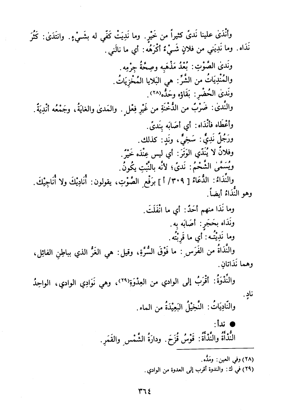 وأنْدَى علينا نَدىً كثيراً من خَيْرٍ . وما نَدِيَتْ كَفّي له بشَيْءٍ . وانتَدَى : كَثُرَ نَدَاه . وما نَدِيَني من فلانٍ شَيْء أكرهُه : أي ما نالَني . ونَدى الصَوْتِ : بُعْدُ مَذْهَبِه وصِحةُ جِرْمِه . والمُنْدِيَاتُ من الشَّرِّ : هي البَلايا المُخْزِيَاتُ . ونَدى الحُضْرِ : بَقَاؤه وحَده . والنَدى : ضَرْب من الدُخْنَةِ من غَيْرِ فِعْلٍ . والمَدى والغايَةُ ، وجَمْعُه أنْدِيَةٌ . وأعْطَاه فأنْدَه : أي أصَابَه بِنَدىً . ورَجُلُ نَدِي : سَخِي ، ونَدٍ : كذلك . وفلان لا يُنَدي الوَتَرَ : أي ليس عِنْدَه خَيْرٌ . ويسَمى الشحْمُ : نَدىً ؛ لأنَه بالنَّبْتِ يكُونُ . والندَاءُ : الدعَاءُ برَفْعِ الصَّوْتِ ، يقولون : أنَادِيْكَ ولا أنَاجِيْكَ . وهو النُّدَاءُ أيضاً . وما نَدَا منهم أحَدٌ : أي ما انْفَلَتَ . ونَدَاه بحَجَرٍ : أصَابَه بِه . وما نَدِيْتُه : أي ما قَرِبْتُه . والندَاةُ من الفَرَسِ : ما فَوْقَ السُّرَّةِ ، وقيل : هي الغَرُّ الذي بباطِنِ الفائِل ، وهما نَدَاتانِ . والنَدْوَةُ : أقْرَبُ إلى الوادي من العِدْوَةِ ، وهي نَوَادِي الوادي ، الواحِدُ نادٍ . والنادِيَات : النَخِيْلُ البَعِيْدَةُ من الماء . ندأ النُدْأةُ والنَدْأةُ : قَوْسُ قُزَحَ . ودارَةُ الشمْسِ والقَمَرِ .