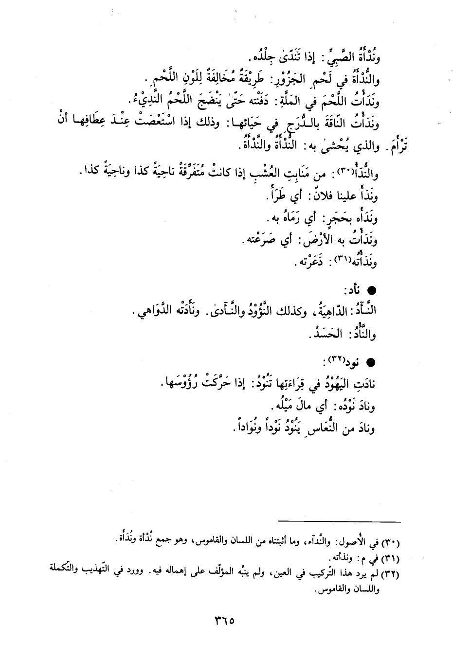 ونُدْأةُ الصَّبِيَ : إذا تَنَدّى جِلْدُه . والنُدْأةُ في لَحْمِ الجَزُوْرِ : طَرِيْقَةٌ مُخَالِفَةٌ لِلَوْنِ اللَّحْمِ . ونَدَأتُ اللَّحْمَ في المَلةِ : دَفَنْته حَتّى يَنْضَجَ اللَّحْمُ النَّدِيْءُ . ونَدَأتُ الناقَةَ بالدرَجِ في حَيَائها : وذلك إذا اسْتَعْصَتْ عِنْدَ عِطَافِها أنْ تَرأمَ . والذي يُحْشى به : الندْأةُ والنَدْأةُ . والنُدَأ : من مَنَابِتِ العُشْبِ إذا كانتْ مُتَفَرِّقَةً ناحِيَةً كذا وناحِيَةً كذا . ونَدَأ علينا فلانٌ : أي طَرأ . ونَدَأه بحَجَرٍ : أي رَمَاهُ به . ونَدَأتُ به الأرْضَ : أي صَرَعْته . ونَدَأتُه : ذَعَرْته . ناد النأدُ : الدّاهِيَةُ ، وكذلك النَّؤُوْدُ والنأدى . ونَأدَتْه الدَّوَاهي . والنَّادُ : الحَسَدُ . نود : نادَتِ اليَهُوْدُ في قِرَاءَتِها تَنُوْدُ : إذا حَركَتْ رُؤُوْسها . ونادَ نَوْدُه : أي مالَ مَيْلُه . ونادَ من النُعَاسِ يَنُوْدُ نَوْداً ونُوَاداً .