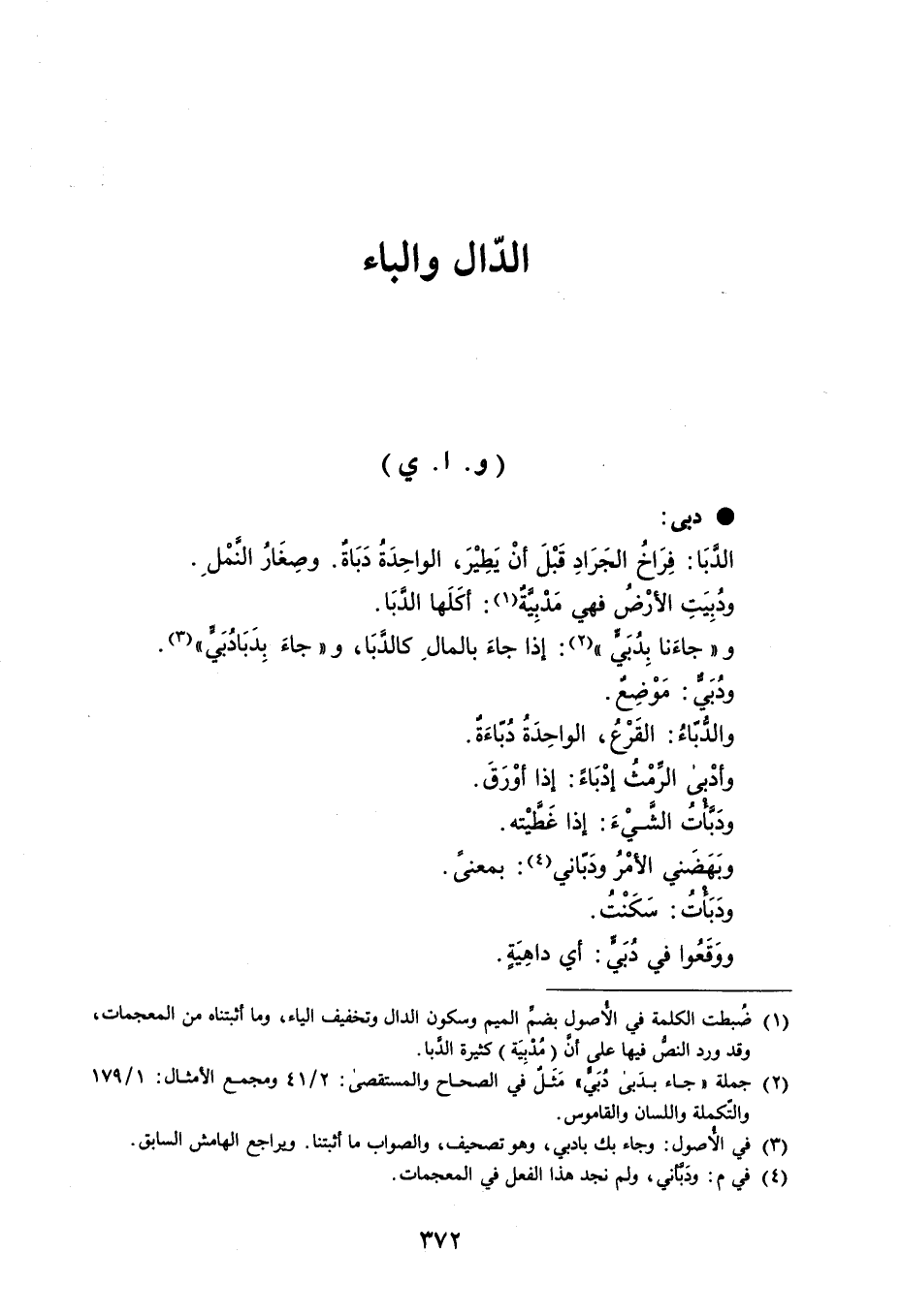 دبى الدَّبَا : فِرَاخُ الجَرَادِ قَبْلَ أنْ يَطِيْرَ ، الواحِدَةُ دَبَاةٌ . وصِغَارُ النمْلِ . ودُبِيَتِ الأرْضُ فهي مَدْبِية : أكَلَها الدَّبَا . وجاءَنا بِدُبَي : إذا جاءَ بالمالِ كالدَبَا ، و جاءَ بِدَبَادُبَيّ . ودُبَي : مَوْضِعٌ . والدُّبّاءُ : القَرْعُ ، الواحِدَةُ دُبّاءَةٌ . وأدْبى الرمْثُ إدْبَاءً : إذا أوْرَقَ . ودَبأتُ الشيْءَ : إِذا غَطَّيْته . وبَهَضَني الأمْر ودَباني : بمعنىً . ودَبَأتُ : سَكَنْتُ . ووَقَعُوا في دُبَي : أي داهِيَةٍ .