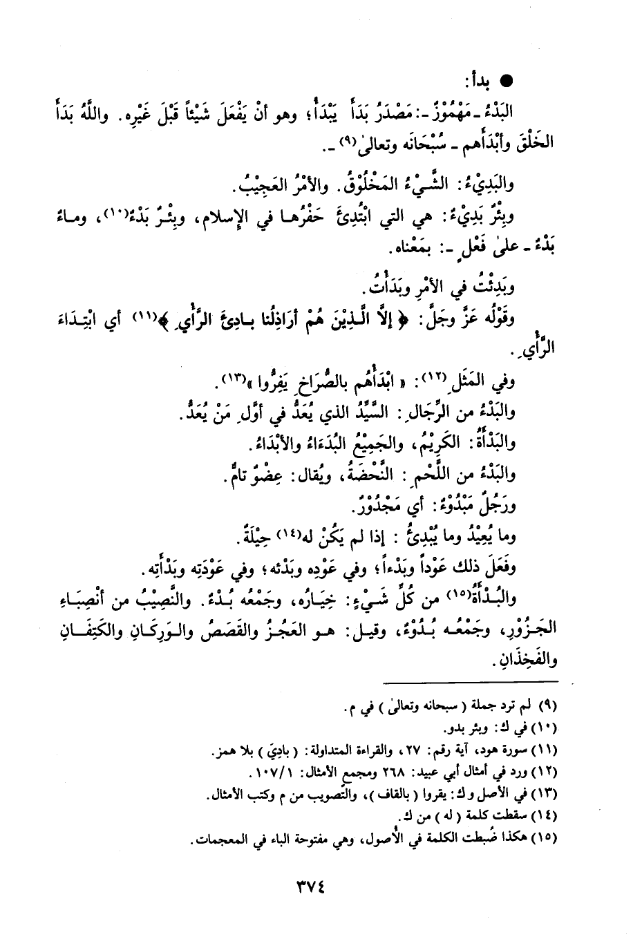 بدأ : البَدْءُ - مَهْمُوْز - : مَصْدَرُ بَدَأ يَبْدَأ ؛ وهو أنْ يَفْعَلَ شَيْئاً قَبْلَ غَيْرِه . واللهُ بَدَأ الخَلْقَ وأبْدَأهم - سُبْحَانَه وتعالى - . والبَدِيْءُ : الشيْءُ المَخْلُوْقُ . والأمْرُ العَجِيْبُ . وبِئْر بَدِيْءَ : هي التي ابْتُدِئ حَفْرُها في الإسلام ، وبِئْر بَدْءٌ ، وماءٌ بدءٌ - على فَعْلٍ - : بمَعْناه . وبَدِئْتُ في الأمرِ وبَدَأتُ . وقَولُه عَز وجَل : ' إلا الذين هُمْ أرَاذِلُنا بادِئَ الرَّأي ' أي ابْتِدَاءَ الرأيَ . وفي المَثَلِ : ' ابْدَأهُم بالصرَاخِ يَفِرُّوا ' . والبَدْء من الرجَالِ : السيِّد الذي يُعَد في أولِ مَنْ يُعَد . والبَدْأةُ : الكَرِيْم ، والجَمِيْعُ البُدَءَاءُ والأبدَاءُ . والبَدْءُ من اللحْمِ : النحْضَةُ ، وُيقال : عِضْوٌ تام . ورَجُلٌ مَبْدُوْء : أي مَجْدُوْر . وما يُعِيْدُ وما يُبْدِئُ : إذا لم يَكُنْ له حِيْلَةٌ . وفَعَلَ ذلك عَوْداً وبَدْءاً ؛ وفي عَوْدِه وبَدْئه ؛ وفي عَوْدَتِه وبَدْأتِه . والبدْأةُ من كُل شَيْءٍ : خِيَارُه ، وجَمْعُه بُدْءٌ . والنصِيْبُ من أنْصِبَاءِ الجَزُوْرِ ، وجَمْعُه بُدُوْء ، وقيل : هو العَجُزُ والقَصَصُ والوَرِكَانِ والكَتِفَانِ والفَخِذَانِ .