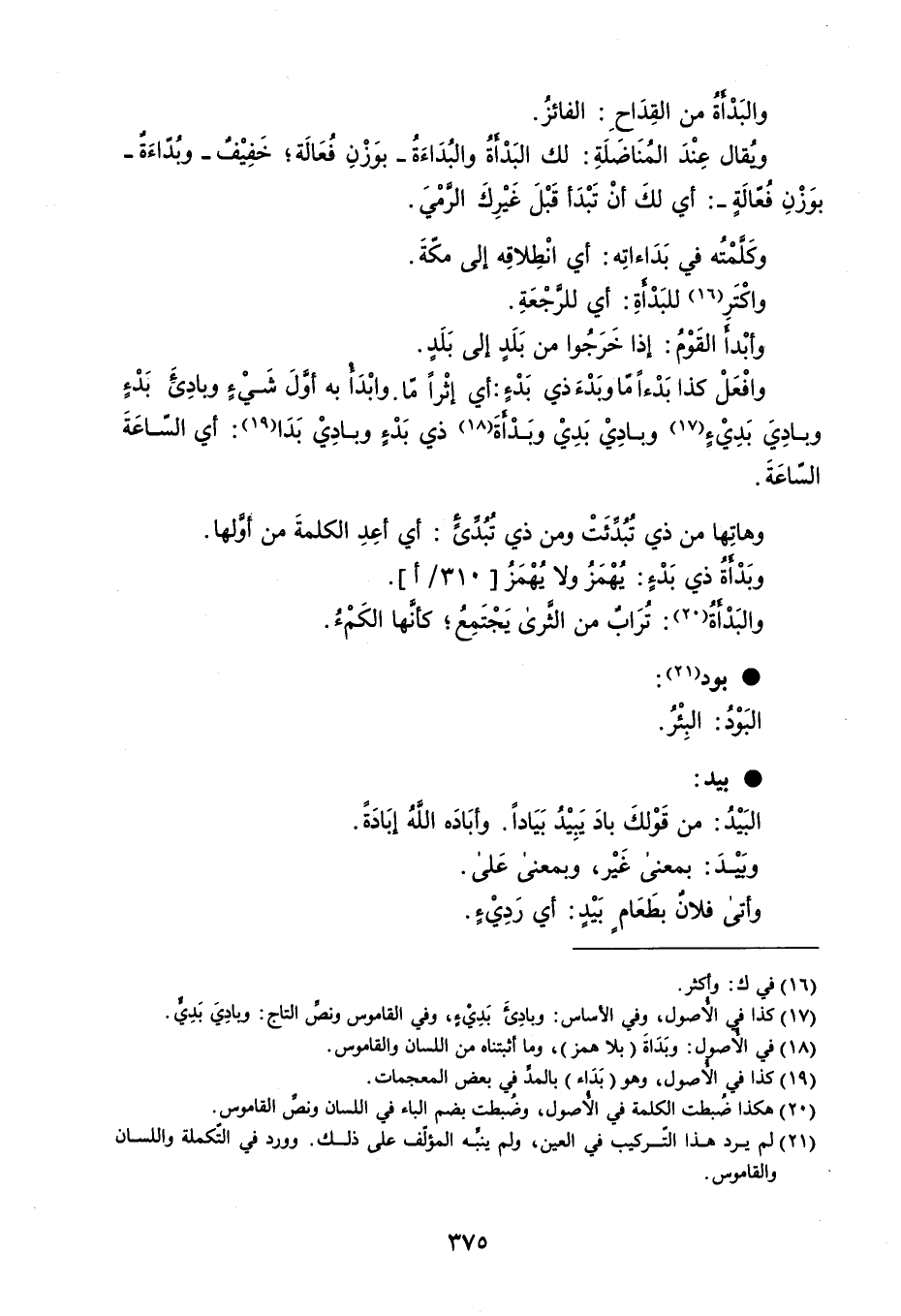 والبَدْأةُ من القِدَاحِ : الفائزُ . وُيقال عِنْدَ المُنَاضَلَةِ : لك البَدْأةُ والبُدَاءَةُ - بوَزْنِ فُعَالَة ؛ خَفِيْفٌ - وبُدّاءَةٌ - بوَزْنِ فُعالَةٍ - : أي لكَ أنْ تَبْدَأ قَبْلَ غَيْرِكَ الرمْيَ . وكَلَمْتُه في بَدَاءاتِه : أي انْطِلاقِه إلى مكّةَ . واكْتَرِ للبَدْأةِ : أي للرجْعَةِ . وأبْدأ القَوْمُ : إذا خَرَجُوا من بَلَدٍ إلى بَلَدٍ . وافْعَلْ كذا بَدْءاً ما وبَدْءَ ذي بَدْءٍ : أي إثْراً ما . وابْدَأ به أولَ شَيْءٍ وبادِئ بَدْءٍ وبادِيَ بَدِيْءٍ وبادِيْ بَدِيْ وبَدْأةَ ذي بَدْءٍ وبادِيْ بَدَا : أي السّاعَةَ الساعَةَ . وهاتِها من ذي تُبُدِّئَتْ ومن ذي تُبُدئ : أي أعِدِ الكلمةَ من أوَّلها . وبَدْأةُ ذي بَدْءٍ : يُهْمَزُ ولا يُهْمَزُ . والبَدْأةُ : تُرَابٌ من الثَّرى يَجْتَمِعُ ؛ كأنها الكَمْءُ . بود البَوْدُ : البِئْرُ . بيد البَيْدُ : من قَوْلكَ بادَ يَبِيْدُ بَيَاداً . وأبَادَه اللهُ إبَادَةً . ويَيْدَ : بمعنى غَيْر ، وبمعنى عَلى . وأتى فلانٌ بطَعَامٍ بَيْدٍ : أي رَدِيْءٍ .