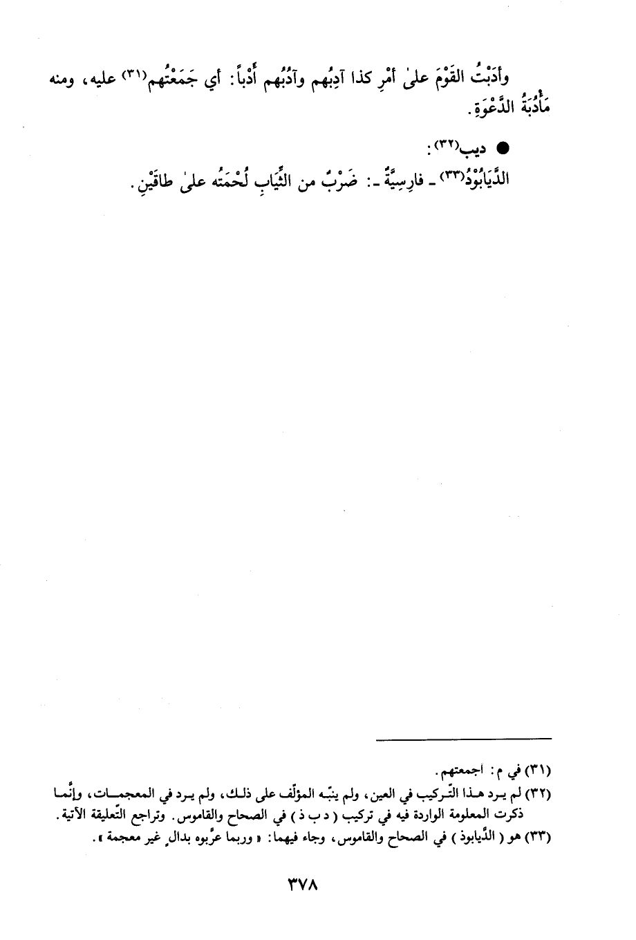 وأدَبْتُ القَوْمَ على أمْرِ كذا آدِبُهم وآدُبُهم أدْباً : أي جَمَعْتُهم عليه ، ومنه مَأدُبَةُ الدَعْوَةِ . ديب الديَابُوْدُ - فارِسِيَّةٌ - : ضَرْبٌ من الثيَابِ لُحْمَتُه على طاقَيْنِ .