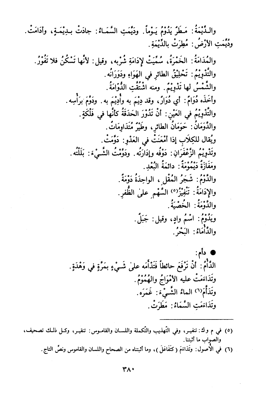 والديْمَةُ : مَطَرٌ يَدُوْمُ يَوْماً . ودَيمَتِ السَّمَاءُ : جادَتْ بدِيْمَةٍ ، وأدَامَتْ . ودُيمَتِ الأرْضُ : مُطِرَتْ بالدَيْمَةِ . والمُدَامَةُ : الخَمْرَةُ ، سُمَيَتْ لإدَامَةِ شُربه ، وقيل : لأنَّها تَسْكُنُ فلا تَفُوْرُ . والتدْويمُ : تَحْلِيْقُ الطائرِ في الهَوَاءِ ودَوَرَانُه . والشَّمْسُ لها تَدْوِيْمٌ . ومنه اشْتُقَّتِ الدُّوّامَةُ . وأخَذَه دُوَامٌ : أي دُوَارٌ ، وقد دِيْمَ به وأدِيْمَ به . ودَوَمَ برأسِه . والتَدْويمُ في العَيْنِ : أنْ تَدُوْرَ الحَدَقَةُ كأنها في فَلْكَةٍ . والدَّوَمَانُ : حَوَمَانُ الطائرِ ، وطَيْرٌ مُتَدَاوِمَاتٌ . وُيقال للكِلاَبِ إذا أمْعَنَتْ في العَدْوِ : دَومَتْ . وتَدْويمُ الزَعْفَرَانِ : دَوْفُه وإدَارَتُه . ودَوَمْتُ الشَّيْءَ : بَلَلْتُه . ومَفَازَةٌ دَيْمُوْمَةٌ : دائمَةُ البُعْدِ . والدَّوْمُ : شَجَرُ المُقْلِ ، الواحِدَةُ دَوْمَةٌ . والِإدَامَةُ : تَنْفِيْزُ السهْمِ على الظفرِ . والدَّوْمَةُ : الخُصْيَةُ . ويدُوْمُ : اسْمُ وادٍ ، وقيل : جَبَلٌ . والدأمَاءُ : البَحْرُ . دأم الدأمُ : أنْ تَرْفَعَ حائطاً فَتَدْأمَه على شَيْءٍ بمَرةٍ في وَهْدَةٍ . وتَدَاءَمَتْ عليه الأمْوَاجُ والهُمُوْمُ . وتَدَأَمَ الماءُ الشيْءَ : غَمَرَه . وتَدَاءَمَتِ السَّمَاءُ : مَطَرَتْ .