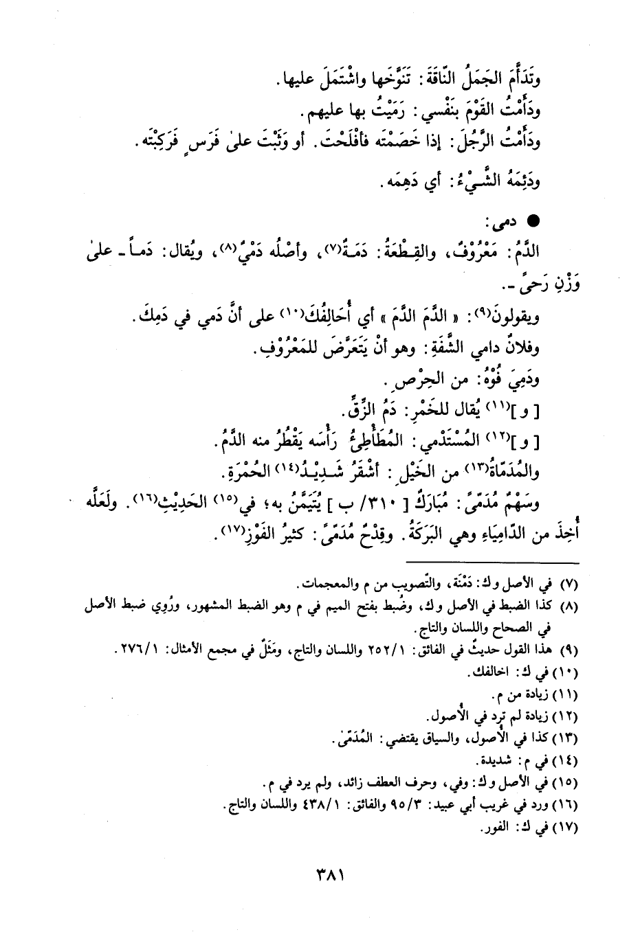 وتَدَأمَ الجَمَلُ الناقَةَ : تَنَوخَها واشْتَمَلَ عليها . ودَأمْتُ القَوْمَ بنَفْسي : رَمَيْت بها عليهم . ودَأمْتُ الرجُلَ : إذا خَصَمْتَه فأفْلَحْتَ . أو وَثَبْتَ على فَرَسٍ فَرَكِبْتَه . ودَئِمَهُ الشيْءُ : أي دَهِمَه . دمى الدمُ : مَعْرُوْف ، والقِطْعَةُ : دَمَةٌ ، وأصْلُه دَمْيٌ ، وُيقال : دَماً - على وَزْنِ رَحىً - . ويقولونَ : ' الدَّمَ الدمَ ' أي أحَالِفُكَ على أنَّ دَمي في دَمِكَ . وفلان دامي الشفَةِ : وهو أنْ يَتَعَرَّضَ للمَعْرُوْفِ . ودَمِيَ فُوْهُ : من الحِرْصِ . و يُقال للخَمْرِ : دَمُ الزِّق . والمُسْتَدْمي : المُطَأطِئ رَأسَه يَقْطُرُ منه الدَّمُ . والمُدَماةُ من الخَيْلِ : أشْقَرُ شَدِيْدُ الحُمْرَةِ . وسَهْم مُدَمى : مُبَارَكٌ يُتَيَمنُ به ؛ في الحَدِيْثِ . ولَعَلَّه أخِذَ من الدامِيَاءِ وهي البَرَكَةُ . وقِدْح مُدَمّىً : كثيرُ الفَوْزِ .