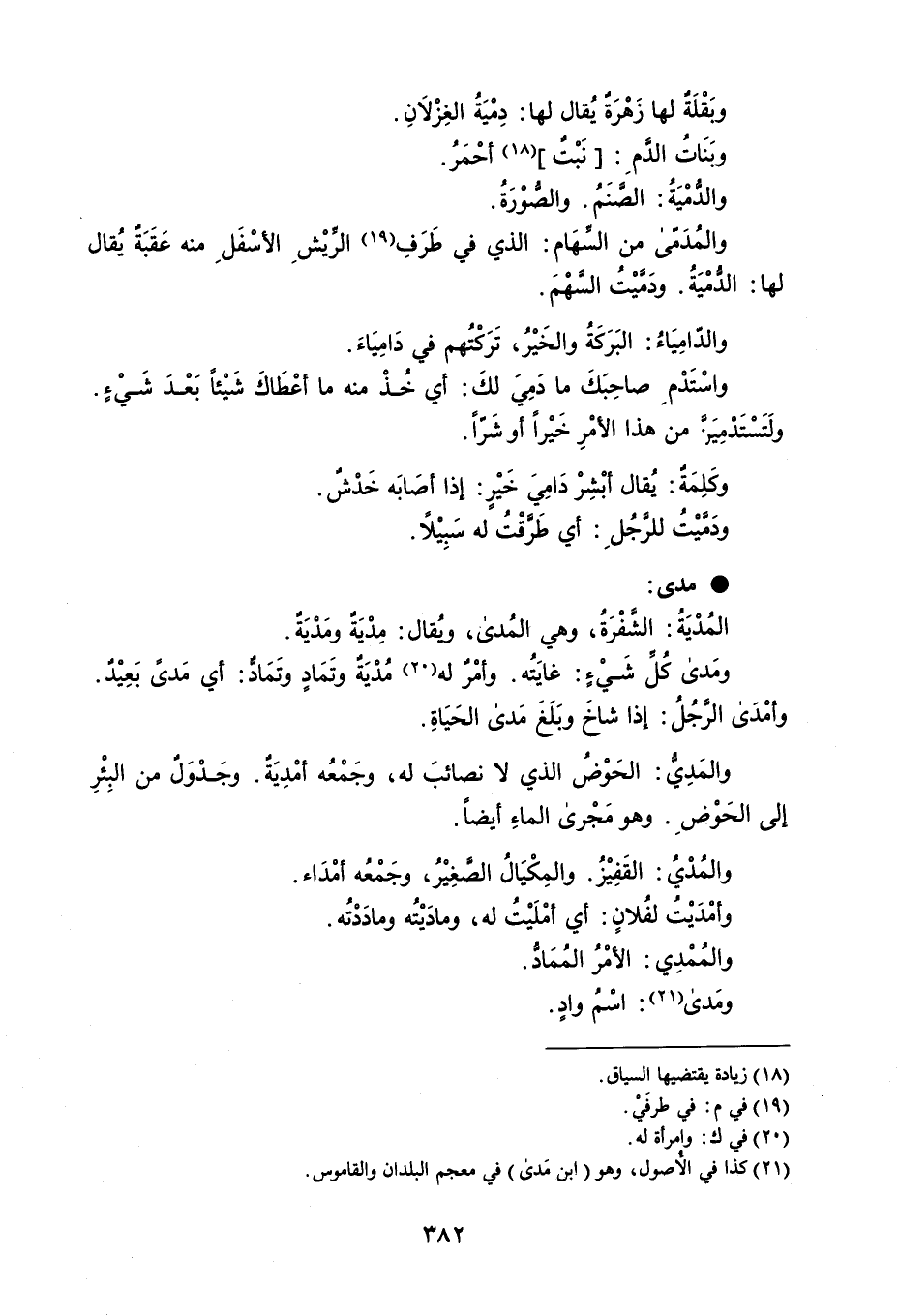 وبَقْلَة لها زَهْرَة يُقال لها : دِمْيَةُ الغِزْلانِ . وبَنَاتُ الدَّمِ : نَبْتٌ أحْمَرُ . والدمْيَةُ : الصنَمُ . والصُّوْرَةُ . والمُدَمى من السهَام : الذي في طَرَفِ الرِّيْشِ الأسْفَلِ منه عَقَبَة يُقال لها : الدمْيَةُ . ودَميْتُ السهْمَ . والدامِيَاءُ : البَرَكَةُ والخَيْرُ ، تَرَكْتُهم في دَامِيَاءَ . واسْتَدْمِ صاحِبَكَ ما دَمِيَ لكَ : أي خُذْ منه ما أعْطَاكَ شَيْئاً بَعْدَ شَيْءٍ . ولَتَسْتَدْمِيَن من هذا الأمْرِ خَيْراً أوشَرّاً . وكَلِمَةٌ : يُقال أبْشِرْ دَامِيَ خَيْرٍ : إذا أصَابَه خَدْشٌ . ودَميْتُ للرجُلِ : أي طَرقْتُ له سَبِيْلاً . مدى المُدْيَةُ : الشفْرَةُ ، وهي المُدى ، وُيقال : مِدْيَةٌ ومَدْيَةٌ . ومَدى كُل شَيْءٍ : غايَتُه . وأمْرٌ له مُدْيَةٌ وتَمَادٍ وتَمَاد : أي مَدىً بَعِيْدٌ . وأمْدَى الرجُلُ : إذا شاخ وبَلَغَ مَدى الحَيَاةِ . والمَدِيُّ : الحَوْضُ الذي لا نصائبَ له ، وجَمْعُه أمْدِيَة . وجَدْوَلٌ من البِئْرِ إلى الحَوْضِ . وهومَجْرى الماءِ أيضاً . والمُدْيُ : القَفِيْزُ . والمِكْيَالُ الصَّغِيْرُ ، وجَمْعُه أمْدَاء . وأمْدَيْتُ لفُلانٍ : أي أمْلَيْتُ له ، ومادَيْتُه ومادَدْتُه . والمُمْدِي : الأمْرُ المُمَادُ . ومَدى : اسْمُ وادٍ .