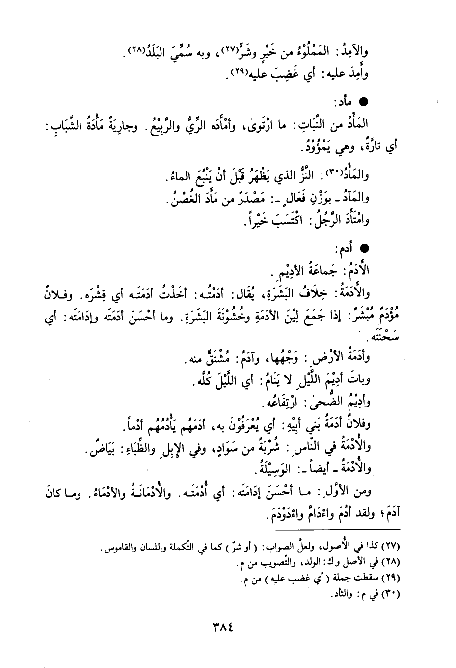 والأمِدُ : المَمْلُوء من خَيْرٍ وشَر ، وبه سُمِّيَ البَلَدُ وأمِدَ عليه : أي غَضِبَ عليه . ماد المَأدُ من النبَاتِ : ما ارْتَوى ، وأمْأدَه الرِّيُّ والربِيْعُ . وجارِيَةٌ مَأدَةُ الشبَابِ : أي تارَةٌ ، وهي يَمْؤُوْدٌ . والمَأدُ : النَّز الذي يَظْهَرُ قَبْلَ أنْ يَنْبُعَ الماءُ . والمَآدُ - بوَزْنِ فَعَالٍ - : مَصْدَر من مَأدَ الغُصْنُ . وامْتَأدَ الرَّجُلُ : اكْتَسَبَ خَيْراً . أدم الأدَمُ : جَماعَةُ الأدِيْمِ . والأدَمَةُ : خِلاَفُ البَشَرَةِ ، يُقَال : أدَمْتُه : أخَذْتُ أدَمَتَه أي قِشْرَه . وفلانٌ مُؤْدَمِِ مُبْشَر : إذا جَمَعَ لِيْنَ الأدَمَةِ وخُشُوْنَةَ البَشَرَةِ . وما أحْسَنَ أدَمَتَه وإدَامَتَه : أي سحنته . وأدَمَةُ الأرْضِ : وَجْهُها ، وآدَمُ : مُشْتَق منه . وباتَ أدِيْمَ التَيْلِ لا يَنَامُ : أي اللَّيْلَ كُلَّه . وأدِيْمُ الضُحى : ارْتِفَاعه . وفلان أدَمَةُ بَني أبِيْهِ : أي يُعْرَفُوْنَ به ، أدَمَهُم يَأدُمُهُم أدْماً . والأدْمَةُ في الناسِ : شُرْبَة من سَوَادٍ ، وفي الإِبِلِ والظبَاءِ : بَيَاض . والأدْمَةُ - أيضاً - : الوَسِيْلَةُ . ومن الأولِ : ما أحْسَنَ إدَامَتَه : أي أدْمَتَه . والأدْمَانَةُ والأدْمَاءُ . وما كانَ آدَمَ ؛ ولقد أدُمَ واءدَامَ واءدَوْدَمَ .