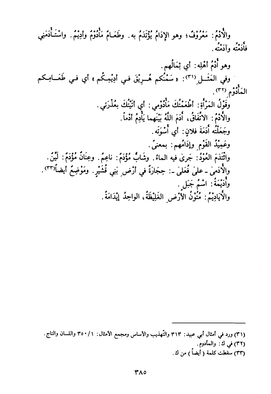 والأدْمُ : مَعْرُوْفٌ ؛ وهو الإِدَامُ يُؤْتَدَمُ به . وطَعَامٌ مَأدُوْمٌ وأدِيْمٌ . واسْتَأدَمَنِي فأدَمْتُه وآدَمْتُه . وهو أدْم أهْلِه : أي ثِمَالُهم . وفي المَثَلِ : ' سَمْنُكم هُرِيْقَ في أدِيْمِكُم ' أي في طَعَامِكم المَأدُوْم . وَقَوْلُ المَرأةِ : أطْعَمْتُكَ مَأدُوْمي : أي أتَيْتُكَ بعُذْرَتي . والأدْمُ : الاتفَاقُ ، أدَمَ اللَّهُ بَيْنَهما يَأدِمُ أدْماً . وجَعَلْتُه أدَمَةَ فلانٍ : أي أسْوَتَه . وعَمِيْدُ القَوْمِ وإدَامُهم : بمعنىً . وائْتَدَمَ العُوْدُ : جَرى فيه الماءُ . وشَاب مُؤْدَم : ناعِمٌ . وعِنَانٌ مُؤْدَم : لَين . والأدَمى - على فُعَلى : حِجَارَة في أرْضِ بَنِي قُشَيْرٍ . ومَوْضِع أيضاً . وأدَيْمَةُ : اسْمُ جَبَل . والأيَادِيْمُ : مُتوْنُ الأرْضِ الغَلِيْظَةُ ، الواحِدُ إيْدَامَةٌ .