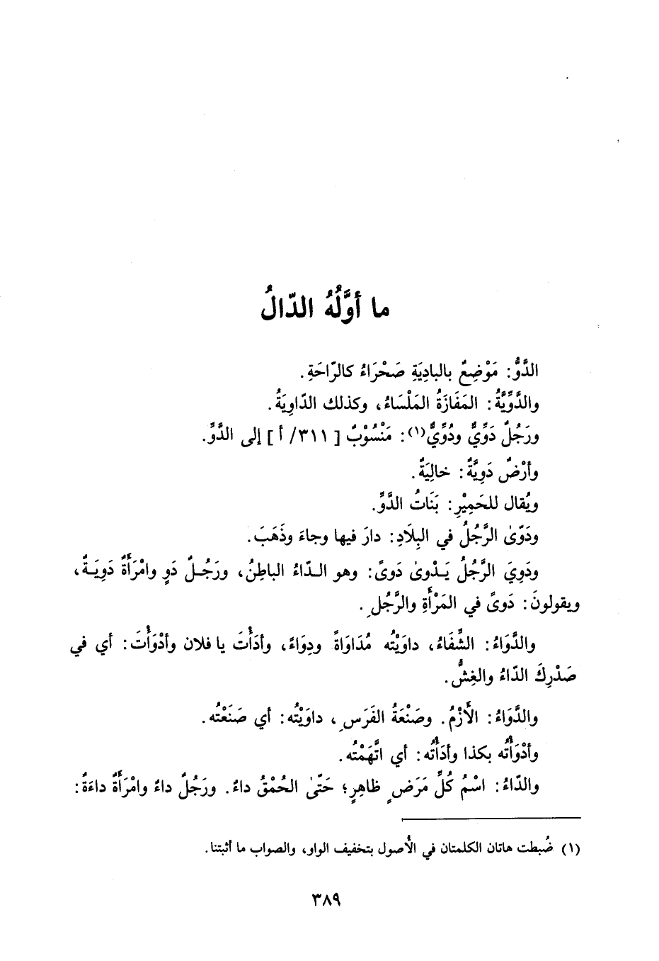 الدو : مَوْضِعٌ بالبادِيَةِ صَحْرَاءُ كالرّاحَةِ . والدويةُ : المَفَازَةُ المَلْسَاءُ ، وكذلك الدّاوِيَةُ . ورَجُل دَوي ودُوِّي : مَنْسُوْبٌ إلى الدو . وأرْض دَوِئةٌ : خالِيَةٌ . وُيقال للحَمِيْرِ : بَنَاتُ الدَّو . ودَوى الرجُلُ في البِلادِ : دارَ فيها وجاءَ وذَهَبَ . ودَوِيَ الرَّجُلُ يَدْوى دَوىً : وهو الذاء الباطِنُ ، ورَجُلٌ دَو وامْرأة دَوِيَةٌ ، ويقولونَ : دَوى في المَرأةِ والرجُلِ . والدوَاءُ : الشفَاءُ ، داويتُه مُدَاوَاةً ودِوَاءً ، وأدَأتَ يا فلان وأدْوَأتَ : أي في صَدْرِكَ الداءُ والغِش . والدوَاءُ : الأزْمُ . وصَنْعَةُ الفَرَسِ ، داويتُه : أي صَنَعْتُه . وأدْوَأته بكذا وأدَأتُه : أي اتَّهَمْتُه . والداءُ : اسْمُ كُلِّ مَرَضٍ ظاهِرٍ ؛ حَتّى الحُمْقُ داءٌ . ورَجُلٌ داءٌ وامْرأةٌ داءَةٌ :