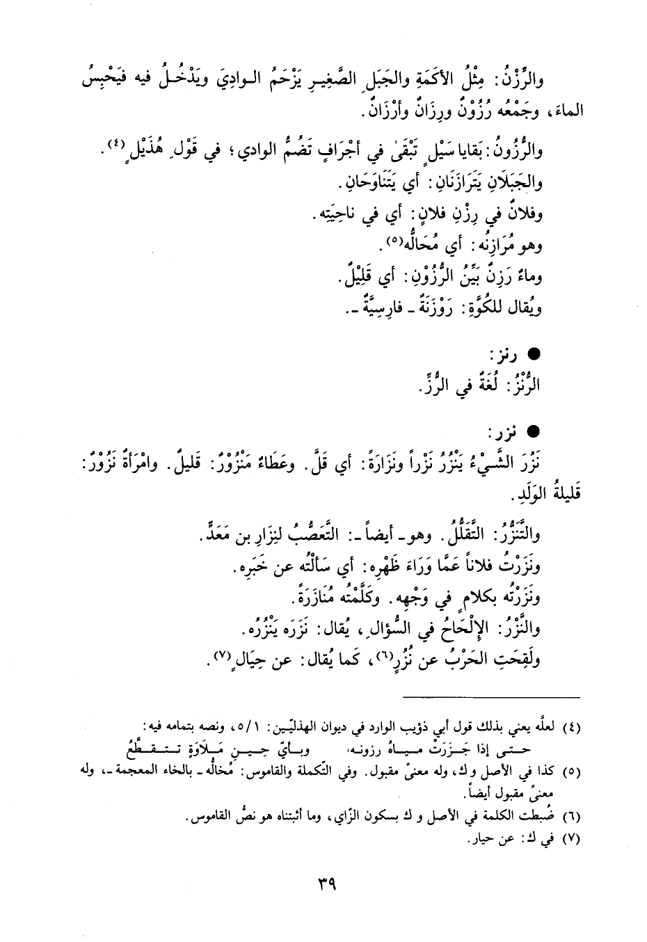 والرزْنُ : مِثْلُ الأكَمَةِ والجَبَلِ الصَّغِيرِ يَزْحَمُ الوادِيَ ويَدْخُلُ فيه فيَحْبِسُ الماءَ ، وجَمْعُه رُزُوْنٌ ورِزَان وأرْزَانٌ . والرُّزُونُ : بَقايا سَيْلِ تَبْقَى في أجْرَافٍ تَضُمُّ الوادي ؛ في قَوْلِ هُذَيْلٍ . والجَبَلانِ يَتَرَازَنَانِ : َ أي يَتَنَاوَحَانِ . وفلانٌ في رِزْنِ فلانٍ : أي في ناحِيَتِه . وهو مُرَازِنُه : أي مُحَالهُ . وماء رَزِن بَيِّنُ الرُّزُوْنِ : أي قَلِيْلٌ . وُيقال للكُوَّةِ : رَوْزَنَةٌ - فارِسِيِّةٌ - . رنز الرُنْزُ : لُغَةٌ في الرُزَ . نزر نَزُرَ الشَّيْءُ يَنْزُرُ نَزْراً ونَزَارَةً أي قَلَّ . وعَطَاءٌ مَنْزُوْرٌ قَليلٌ . وامْرَأةٌ نَزُوْرٌ قَليلةُ الوَلَدِ . والتَّنَزُرُ : التَقَلل . وهو - أيضاً - : التَّعَصُّبُ لنِزَارِ بن مَعَذ . ونَزَرْتُ فلاناً عَمَّا وَرَاءَ ظَهْرِه : أي سألته عن خَبَرِه . ونَزَرْتُه بكلامٍ في وَجْهِه . وكَلَمْتُه مُنَازَرَةً . والنَزْرُ : الإلْحَاحُ في السؤالِ ، يُقال : نَزَرَه يَنْزُرُه . ولَقِحَتِ الحَرْبُ عن نُزُرٍ ، كَما يُقال : عن حِيَالٍ .