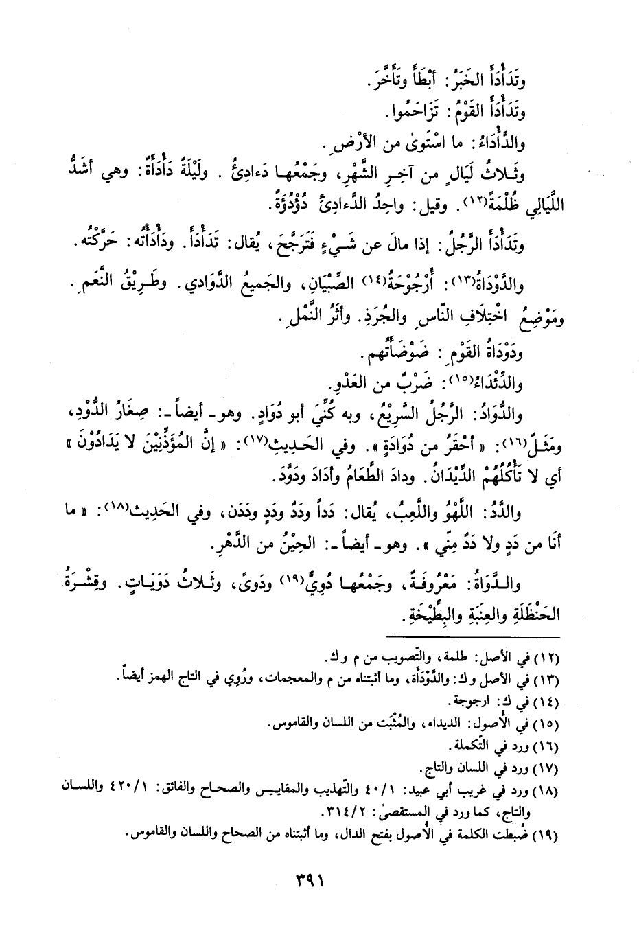 وتَدَأدَأ الخَبَرُ : أبْطَأ وتَأخَّرَ . وتَدَأدَأ القَوْمُ : تَزَاحَمُوا . والدَّأدَاءُ : ما اسْتَوى من الأرْضِ . وثَلاثُ لَيَالٍ من آخِرِ الشهْرِ ، وجَمْعُها دَءادِى . ولَيْلَة دَأدَأةٌ : وهي أشَدُّ اللَيَالِي ظُلْمَةً . وقيل : واحِدُ الدَءادِئ دُؤْدُؤَةٌ . وتَدَأدَأ الرجُلُ : إذا مالَ عن شَيْءٍ فَتَرَجَّحَ ، يُقال : تَدَأدَأ . ودَأدَأتُه : حَرَّكْتُه . والدوْدَاةُ : أرْجُوْحَةُ الصّبْيَانِ ، والجَميعُ الدَّوَادي . وطَرِيْقُ النَّعَمِ . ومَوْضِعُ اخْتِلَافِ الناسِ والجُرَذِ . وأثَرُ النَّمْلِ . ودَوْدَاةُ القَوْمِ : ضَوْضَأتهم . والدَئْدَاءُ : ضَرْبٌ من العَدْوِ . والدُوَادُ : الرَّجُلُ السَّرِيْعُ ، وبه كُنِّيَ أبو دُوَادٍ . و هو - أيضاً - : صِغَارُ الدُّوْدِ ، ومَثَلٌ : ' أحْقَرُ من دُوَادَةٍ ' . وفي الحَدِيثِ : ' إنَّ المُؤَذنِيْنَ لا يَدَادُوْنَ ' أي لا تَأكُلُهُمْ الديْدَانُ . ودادَ الطَعَامُ وأدَادَ ودَودَ . والددُ : اللهْو والتَعِبُ ، يُقال : دَداً ودَدٌ ودَدٍ ودَدَن ، وفي الحَدِيث : ' ما أنَا من دَدٍ ولا دَدٌ مِني ' . وهو - أيضاً - : الحِيْن من الدهْرِ . والدَوَاةُ : مَعْرُوفَةٌ ، وجَمْعُها دُوِي ودَوىً ، وثَلاثُ دَوَيَاتٍ . وقِشْرَةُ الحَنْظَلَةِ والعِنَبَةِ والبِطَيْخَةِ .
