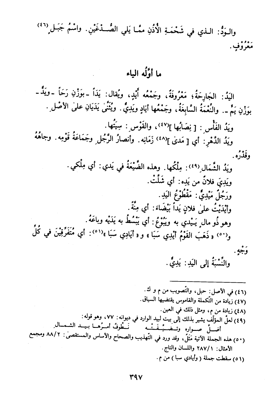 اليَدُ : الجَارِحَةُ ؛ مَعْرُوفَة ، وجَمْعُه أيْدٍ ، ويُقال : يَدَاً - بوَزْنِ رَحَاً - وَيد - بوَزْنِ يَم - . والنَعْمَةُ السابِغَةُ ، وجَمْعُها أيادٍ ويَدِي . ويُثَنَى يَدَيَانِ على الأصْلِ . وَيدُ الفَأسِ : نِصَابُها ، والقَوْسِ : سِيَتُها . وَيدُ الدهْرِ : أي مَدى زَمَانِه . وأنصارُ الرَّجُلِ وجَمَاعَةُ قَوْمِه . وجاهُهُ وقَدْره . ويَدُ الشمَالِ : مِلْكُها . وهذه الضَّيْعَةُ في يَدي : أي مِلْكي . وَيدِيَ فلان من يَدِه : أي شَلتْ . ورَجُل مَيْدِي : مَقْطُوْعُ اليَدِ . وأيْدَيْت على فلانٍ يَداً بَيْضَاءَ : أي مِنةً . وهو ذُو مالٍ يَيْدي به وَيبُوْعُ : أي يَبْسطُ به يَدَيْه وباعَهُ . و ' ذَهَبَ القَوْمُ أيْدِي سَبَا ' و ' أيَادِي سَبَا : أي مُتَفَرِّقِيْنَ في كُل وجه . والنَسْبَةُ إلى اليَدِ : يَدِي .