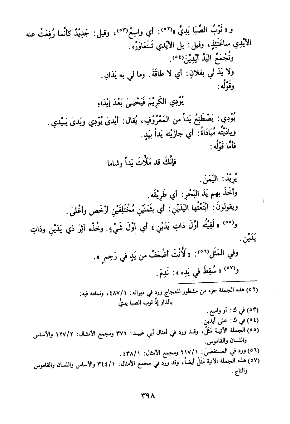 وثَوْبُ الصبَا يَدِي : أي واسِع ، وقيل : جَدِيْد كأنما رُفِعَتْ عنه الأيْدِي ساعَتَئِذٍ ، وقيل : بل الأيْدي تَتَعَاوَرُه . وتُجْمَعُ اليَدُ أيْدِيْنَ . ولا يَدَ لي بفلانٍ : أي لا طاقَةَ . وما لي به يَدَانِ . وقَوْلُه : يُوْدِي الكَرِيْمَ فَيَحْيى بَعْدَ إيْدَاءِ يُوْدِي : يَصْطَنِعُ يَداً من المَعْرُوْفِ ، يُقال : أيْدى يُوْدِي وَيدى يَيْدي . ويادَيْتُه مُيَادَاةً : أي جازَيْته يَداً بيَدٍ . فأما قَوْلُه : فإنكَ قد مَلأتَ يَداً وشاما يُرِيْدُ : اليَمَنَ . وأخَذَ بهم يَدَ البَحْرِ : أي طَرِيْقَه . ويقولونَ : ابْتَعتُها اليَدَيْنِ : أي بثَمَنَيْنِ مُخْتَلِفَيْنِ أرْخَص وأغْلى . ولَقِيْتُه أولَ ذاتِ يَدَيْنِ أي أولَ شَيْءٍ . وخُذْه آثِرَ ذي يَدَيْنِ وذاتِ يدين . وفي المَثَل : ' لأنْتَ أضعفُ من يَدٍ في رَحِمٍ ' . و ' سُقِطَ في يَدِه ' : نَدِمَ .