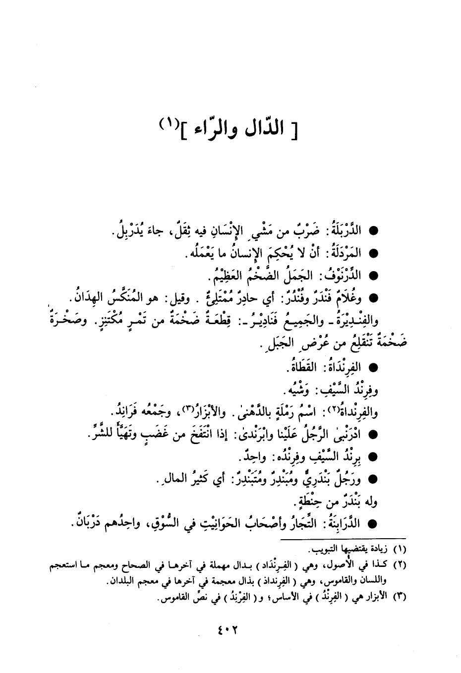 الدرْبَلَةُ : ضَرْبٌ من مَشْيِ الإنْسَانِ فيه ثِقَل ، جاءَ يُدَرْبِلُ . المَرْدَلَةُ أنْ لا يُحْكِمَ الإنسانُ ما يَعْمَلُه . الدرْنَوْفُ الجَمَلُ الضَّخْمُ العَظِيْمُ . وغُلَامٌ فَنْدَرٌوفُنْدُرٌ أي حادِرٌ مُمْتَلِئ . وقيل هو المُنَكسُ الهِدَانُ . والفِنْدِيْرَةُ - والجَمِيعُ فَنَادِيْرُ - قِطْعَةٌ ضَخْمَةٌ من تَمْر مُكْتَنِزٍ . وصَخْرَةٌ ضَخْمَةٌ تَنْقَلِعُ من عُرْضِ الجَبَلِ . الفِرِنْدَاةُ القَطَاةُ . وفِرِنْدُ السَّيْفِ : وَشْيُه . والفِرِنْداةُ : اسْمُ رَمْلَةٍ بالدهْنى . والأبْزَارُ ، وجَمْعُه فَرَانِدُ . ادْرَنْبى الرجُلُ عَلَيْنا وابْرَنْدى إذا انْتَفَخَ من غَضَبٍ وتَهَيأ للشر . بِرِنْدُ السَّيْفِ وفِرِنْدُه واحِدٌ . ورَجُلٌ بَنْدَرِي ومُبَنْدِر ومُتَبَنْدِرٌ أي كَثيرُ المالِ . وله بَنْدَرٌ من حِنْطَةٍ . الدرَابِنَةُ التِّجَارُ وأصْحَابُ الحَوَانِيْتِ في السُّوْقِ ، واحِدُهم دَرْبَان .