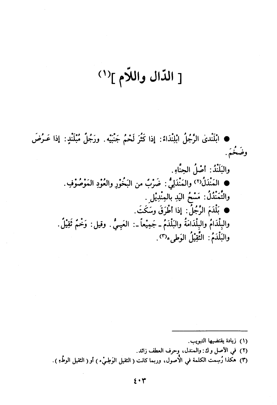 ابْلَنْدى الرَّجُلُ ابْلِنْدَاءً إذا كَثُرَ لَحْمُ جَنْبَيْه . ورَجُل مُبْلَنْدٍ : إذا عَرُضَ وضَخُمَ . والبَلَنْدُ : أصْلُ الحِناءِ . المَنْدَلُ والمَنْدَلي ضَرْبٌ من البَخُوْرِ والعُودِ المَوصُوفِ . والتمَنْدُلُ : مَسْحُ اليَدِ بالمِنْدِيْلِ . بَلْدَمَ الرَّجُل إذا أطْرَقَ وسَكَتَ . والبِلْدَامُ والبلْدَامَةُ والبَلْدَمُ - جَمِيْعاً - : العَيِي . وقيل : وَخْمٌ ثَقِيْلٌ . والبَلْدَمُ : الثقِيْلُ الوَطىء .