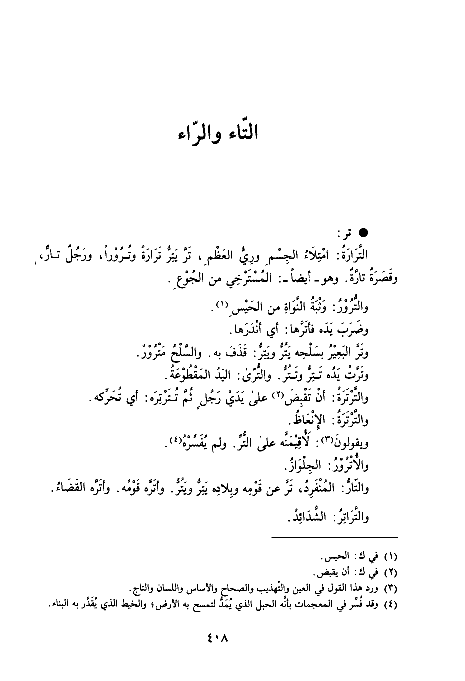 تر : التَرَارَةُ : امْتلاءُ الجِسْمِ ورِيُّ العَظْمِ ، تَرَّ يَتِرُّ تَرَارَةً وتُرُوْراً ، ورَجُلٌ تارٌّ ، وقَصَرَةٌ تارَّةٌ . وهو أيضاً : المُسْتَرْخِي من الجُوْعِ . والتُّرُوْرُ : وَثْبَةُ النَّوَاةِ من الحَيْسِ . وضَرَبَ يَدَه فأتراها : أي أنْدَرَها . وتَرَّ البَعِيْرُ بسَلْحِه يَتُرُ ويَتِرُّ : قَذَفَ به . والسَّلْحُ مَتْرُوْرٌ . وتَرَتْ يَدُه تَتِرُّ وتَتُر . والتُّرّى : اليَدُ المَقْطُوْعَة . والتَرْتَرَةُ : أنْ تَقْبِضَ على يَدَيْ رَجُلٍ ثم تُتَرْتِرَه : أي تُحَركه . والترْتَرَةُ : الإنْعَاظُ . ويقولونَ : لأقِيْمَنَّه على التُرِّ . ولم يُفَسِّرْهُ . والأترُوْرُ : الجِلْوَازُ . والتّارُّ : المُنْفَرِدُ ، تَر عن قَوْمِه وبِلادِه يَتِرُّ ويَتُرُّ . وأتَره قَوْمه . وأتَره القَضَاءُ . والتَرَاتِرُ : الشدَائِدُ .