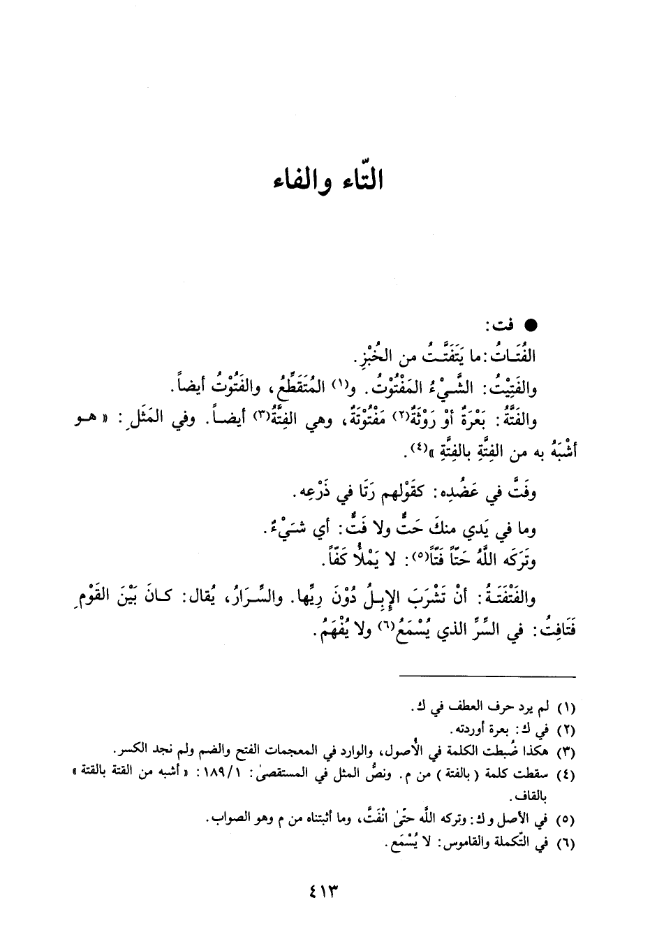 فت الفُتَاتُ : ما يَتَفَتتُ من الخُبْزِ . والفَتِيْتُ : الشيْءُ المَفْتُوْتُ . والمُتَقَطَعُ ، والفَتُوْتُ أيضاً . والفَتَةُ : بَعْرَةٌ أوْ رَوْثَة مَفْتُوْتَةٌ ، وهي الفِتَةُ أيضاً . وفي المَثَلِ : ' هو أشْبَهُ به من الفِتةِ بالفِتَّةِ ' . وفَت في عَضُدِه : كقَوْلهم رَتَا في ذَرْعِه . وما في يَدي منكَ حَت ولا فَت : أي شَيْءٌ . وتَرَكَه اللَّهُ حَتّاً فَتاً : لايَمْلأ كَفّاً . والفَتْفَتَةُ : أنْ تَشْرَبَ الِإبِلُ دُوْنَ رِيها . والسِّرَارُ ، يُقال : كانَ بَيْنَ القَوْمِ فَتَافِتُ : في السَرِّ الذي يُسْمَعُ ولا يُفْهَمُ .