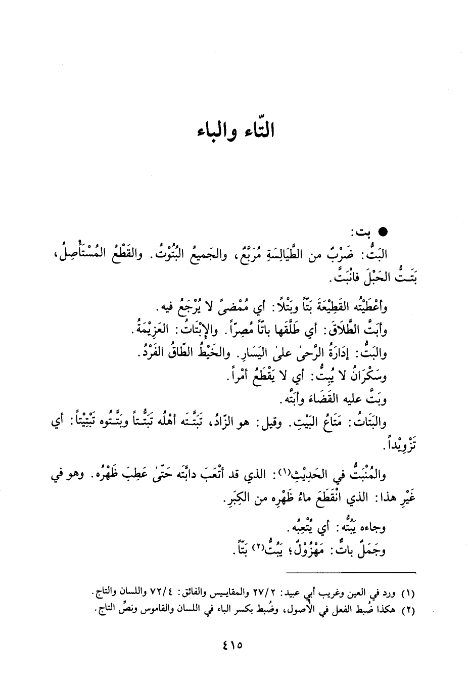 بت البَتُ : ضَربٌ من الطَّيَالِسَةِ مُرَبَّعٌ ، والجَميعُ البُتُوْتُ . والقَطْعُ المُسْتَأصِلُ ، بَتَتُّ الحَبْلَ فانْبَت . وأعْطَيْتُه القَطِيْعَةَ بَتّاً وبَتْلاً : أي مُمْضىً لا يُرْجَعُ فيه . وأبَتَ الطَلاَقَ : أي طَلَقَها باتّاً مُصِرّاً . والإبْتَاتُ : العَزِيْمَةُ . والبَتُ : إدَارَةُ الرَّحى على اليَسَارِ . والخَيْطُ الطّاقُ الفَرْدُ . وسَكْرَانُ لا يُبِتُ : أي لا يَقْطَعُ أمْراً . وبَتَ عليه القَضاءَ وأبَتَّه . والبَتَاتُ : مَتَاعُ البَيْتِ . وقيل : هو الزّادُ ، تَبَتَّتَه أهْلُه تَبَتُّتاً وبَتَّتُوه تَبْتِيْتاً : أي تَزْويداً . والمُنْبَتُّ في الحَدِيْثِ : الذي قد أتْعَبَ دابَّتَه حَتّى عَطِبَ ظَهْرُه . وهو في غَيْرِهذا : الذي انْقَطَعَ ماءُ ظَهْرِه من الكِبَرِ . وجاءه يَبُتُّه : أي يُتْعِبُه . وجَمَلٌ باتٌّ : مَهْزُوْلٌ ؛ يَبتُ بَتّاً .