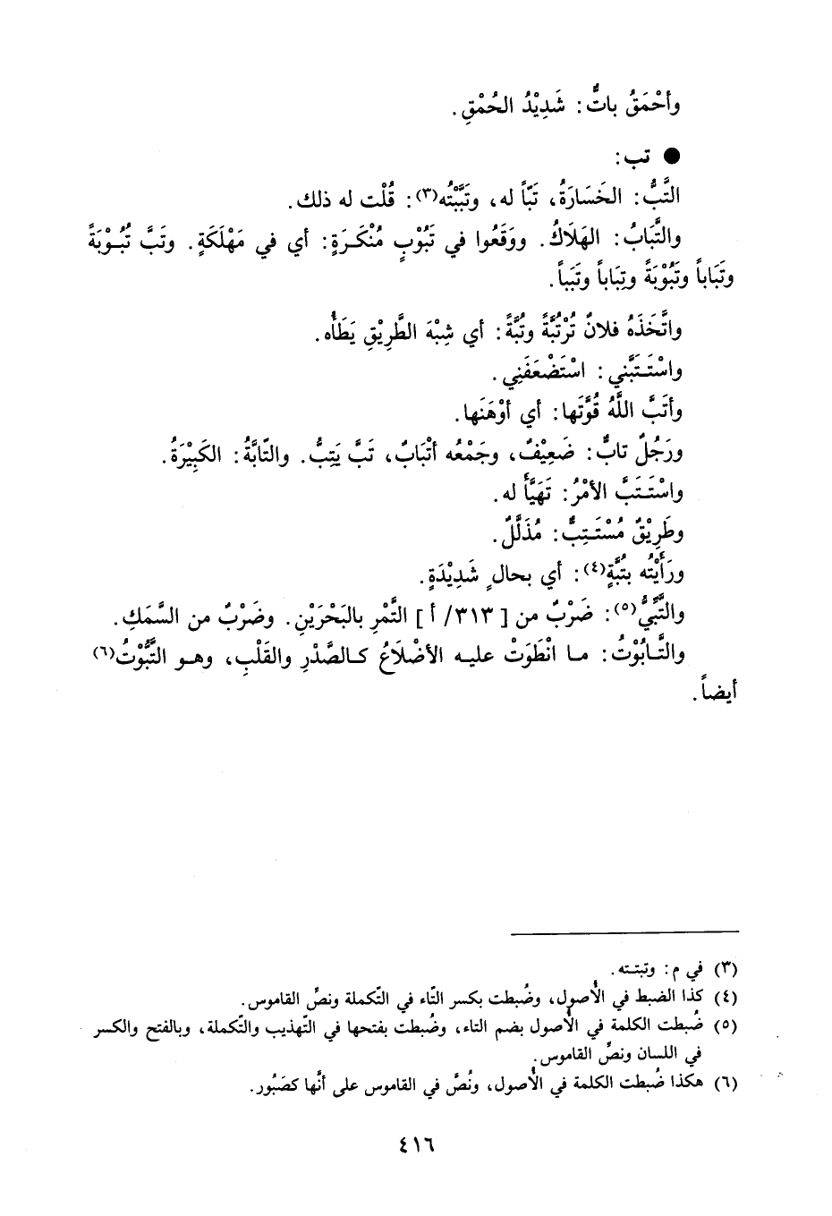 وأحْمَقُ بات : شَدِيْدُ الحمْقِ . تب التَّبُ : الخَسَارَةُ ، تَبّاً له ، وتَبَّبْتُه : قُلْت له ذلك . والتَّبَابُ : الهَلاَك . ووَقَعُوا في تَبُوْب مُنْكَرَةٍ : أي في مَهْلَكَةٍ . وتَبَّ تُبُوْبَةً وتَبَاباً وتَبُوْبَةً وتبَاباً وتَبَباً . واتَخَذَهُ فلانٌ تُرْتُبَّةً وتُبَّةً : أي شِبْهَ الطَرِيْقِ يَطَأه . واسْتَتَبني : اسْتَضْعَفَنِي . وأتَبَّ اللَهُ قُوَّتَها : أي أوْهَنَها . ورَجُلٌ تاب : ضَعِيْفٌ ، وجَمْعُه أتْبَابٌ ، تَبَّ يَتِبُّ . والتّابَّةُ : الكَبيْرَةُ . واسْتَتَبَ الأمْرُ : تَهَيَّأ له . وطَريْقٌ مُسْتَتِب : مُذَلَّلٌ . ورَأيتُه بتُبةٍ : أي بحالٍ شَدِيْدَةٍ . والتَّبَيُّ : ضَرْبٌ من التَّمْرِ بالبَحْرَيْنِ . وضَرْبٌ من السَّمَكِ . والتابُوْتُ : ما انْطَوَتْ عليه الأضْلاَعُ كالصَدْرِ والقَلْب ، وهو التَبُّوْتُ أيضاً .