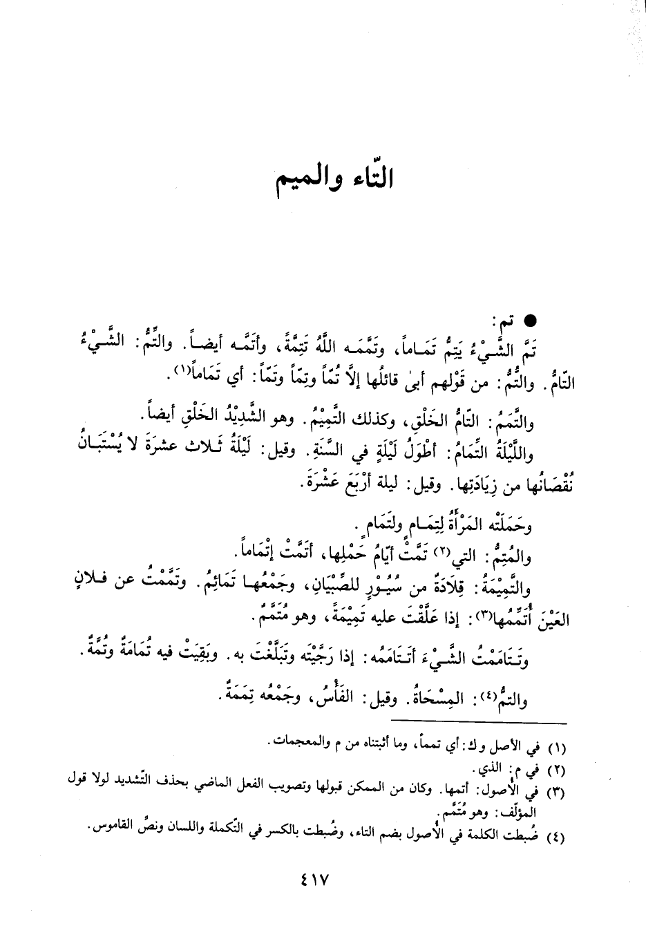 تم تَمَّ الشيْءُ يَتِمُّ تَمَاماً ، وتَمَّمَه اللّهُ تَتِمَةَ ، وأتَمَه أيضاً . والتمُّ : الشيْءُ التّامُّ . والتُّم : من قولهم أبى قائلُها إلاتُمّاً وتمّاً وتَمّاً : أي تَمَاماً . والتَّمَمُ : التّام الخَلْقِ ، وكذلك التَّمِيْمُ . وهو الشَّدِيْدُ الخَلْقِ أيضاً . واللَّيْلَةُ التِّمَامُ : أطْوَلُ لَيْلَةٍ في السَّنَةِ . وقيل : لَيْلَةُ ثَلاث عشرَةَ لا يُسْتَبَانُ نُقْصَانُها من زِيَادَتِها . وقيل : ليلة أرْبَعَ عَشْرَةَ . وحَمَلَتْه المَرأةُ لِتِمَام ولتَمَامَ . والمُتِمُّ : التي تَمَّتْ أيّامُ حمْلِها ، أتَمَّتْ إتْمَاماً . والتَّمِيْمَةُ : قِلَادَة من سُيُوْرٍ للصِّبْيَانِ ، وجَمْعُها تَمَائِم . وتَمَمْتُ عن فلانٍ العَيْنَ أتَمِّمها : إذا عَلَّقْتَ عليه تَمِيْمَةً ، وهو مُتَمَّمٌ . وتَتَامَمْتُ الشَّيْءَ أتَتَامَمُه : إذا رَجَّيْتَه وتَبَلَّغْتَ به . وبَقِيَتْ فيه تُمَامَةٌ وتُمَّةٌ . والتم : المِسْحَاةُ . وقيل : الفَأسُ ، وجَمْعُه تِمَمَةٌ .