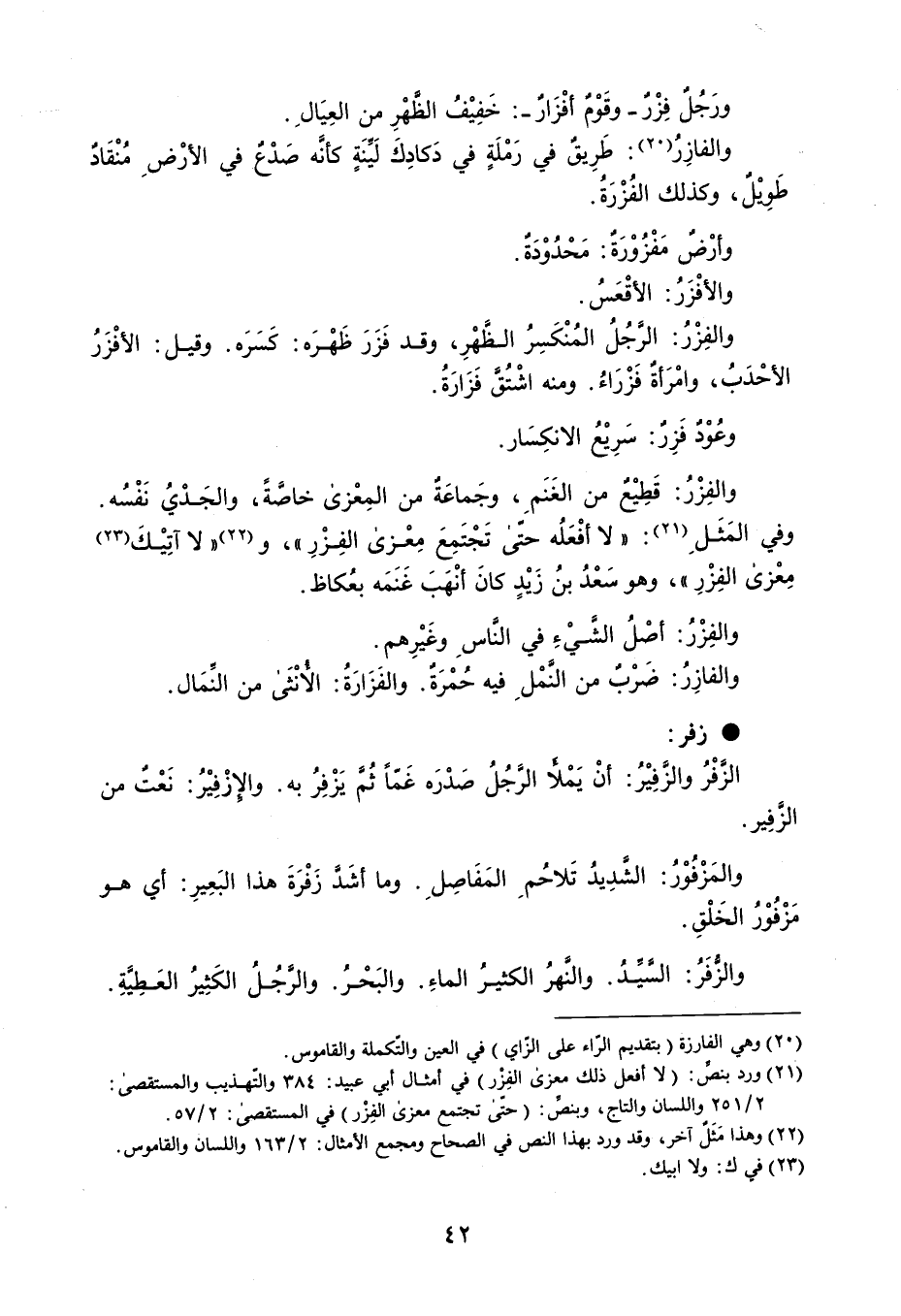 ورَجُلٌ فِزْرٌ - وقَوْم أفْزَارٌ - : خَفِيْفُ الظَّهْرِ من العِيَالِ . والفازِرُ : طَرِيقٌ في رَمْلَةٍ في دَكادِكَ لَيِّنَةٍ كأنَّه صَدْعٌ في الأرْضِ مُنْقَادٌ طَوِيْلٌ ، وكذلك الفزْرَةُ . وأرْضٌ مَفْزُوْرَةٌ : مَحْدُوْدَةٌ . والأفْزَرُ : الأقْعَسُ . والفِزْرُ : الرجُلُ المُنْكَسِرُ الظَّهْرِ ، وقد فَزَرَ ظَهْرَه : كَسَرَه . وقيل : الأفْزَرُ الأحْدَبُ ، وامْرَأةٌ فَزْرَاءُ . ومنه اشْتُق فَزَارَةُ . وعُوْد فَزِرٌ : سَرِيْعُ الانكِسَار . والفِزْرُ : قَطِيْعٌ من الغَنَمِ ، وجَماعَةٌ من المِعْزى خاصَةً ، والجَدْيُ نَفْسُه . وفي المَثَلِ : ' لا أفْعَلُه حتّى تَجْتَمِعَ مِعْزى الفِزْرِ ' ، و ' لا آتِيْكَ مِعْزى الفِزْرِ ' ، وهو سَعْدُ بنُ زَيْدٍ كانَ أنْهَبَ غَنَمَه بعُكاظ . والفِزْرُ : أصْلُ الشَّيْءِ في النَاسِ وغَيْرِهم . والفازِرُ : ضَرْبٌ من النَّمْلِ فيه حُمْرَةٌ . والفَزَارَةُ : الأنْثَى من النَمَال . زفر الزَفْرُ والزَفِيْرُ أنْ يَمْلأ الرجُلُ صَدْرَه غَمّاً ثُمَّ يَزْفِرُ به . والإزْفِيْرُ نَعْتٌ من الزَّفِير . والمَزْفُوْرُ : الشدِيدُ تَلاحُمِ المَفَاصِلِ . وما أشَدَّ زَفْرَةَ هذا البَعِيرِ : أي هو مَزْفُوْرُ الخَلْقِ . والزفَرُ : السيدُ . والنهرُ الكثيرُ الماءِ . والبَحْرُ . والرجُلُ الكَثِيرُ العَطِيةِ .