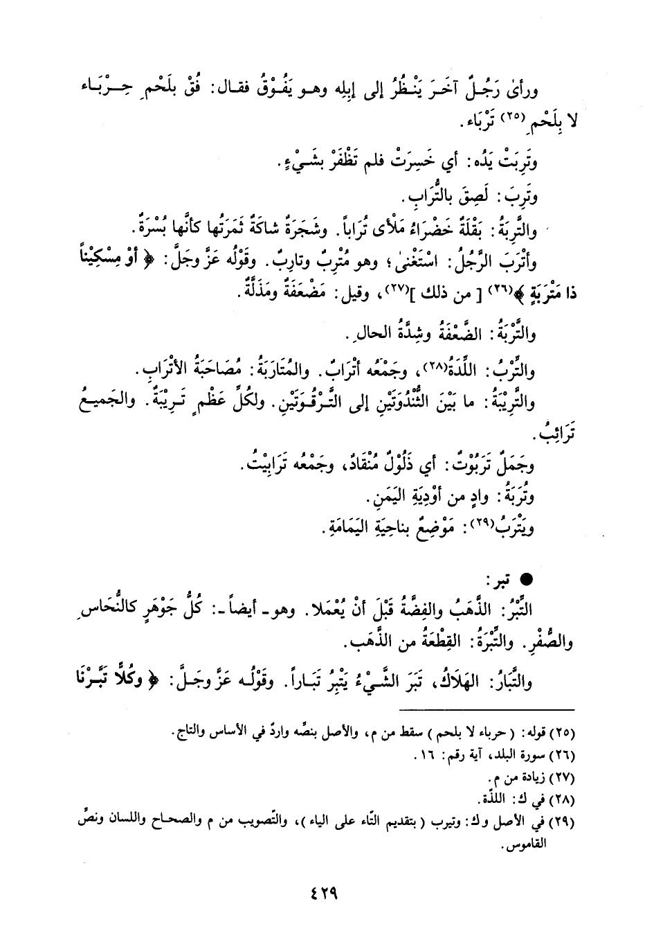 ورأى رَجُلٌ آخَرَ يَنْظُرُ إلى إِبِلِه وهو يَفُوْقُ فقال : فُقْ بلَحْمِ حِرْبَاء لا بِلَحْمَ تَرْبَاء . وتَرِبَتْ يَدُه : أي خَسِرَتْ فلم تَظْفَر بشَيْءٍ . وتَرِبَ : لَصِقَ بالتُّرَابِ . والتَرِبَةُ : بَقْلَة خَضْرَاءُ مَلْأى ترَاباً . وشَجَرَةٌ شاكَةٌ ثَمَرَتُها كأنَّها بُسْرة . وأتْرَبَ الرجُلُ : اسْتَغنى ؛ وهو مُتْرِبٌ وتارِبٌ . وقَوْله عَزَّوجَل : ' أوْ مِسْكِيْناً ذا مَتْرَبَةٍ ' من ذلك ، وقيل : مَضعفَة ومَذَلَّةٌ . والترْبَةُ : الضفَةُ وشِدَةُ الحالَ . والترْبُ : اللدَةُ ، وجَمعه أتْرَاب . والمُتَارَبَة : مُصَاحَبَةُ الأتْرَابِ . والترِيْبَةُ : ما بَيْنَ الثنْدُوَتَيْنِ إلى الترْقُوَتَيْنِ . ولكهلِّ عَظْمٍ تَرِيْبَةٌ . والجَميعُ تَرَائِبُ . وجَمَلٌ تَرَبُوْتٌ : أي ذَلُوْل مُنْقَادٌ ، وجَمْعه تَرَابِيْتُ . وتُرَبَةُ : وادٍ من أوْدِيَةِ اليَمن . وَيترَبُ : مَوْضِعٌ بناحِيَةِ اليَمَامَةِ . تبر التبْرُ : الذَّهَبُ والفِضةُ قَبْلَ أنْ يُعْمَلا . وهو - أيضاً - : كُل جَوْهَرٍ كالنُّحَاسِ والصُّفْرِ . والتبْرَةُ : القِطْعَةُ من الذَّهَب . والتَّبَارُ : الهَلَاكُ ، تَبَرَ الشَّيْءُ يَتْبِرُ تَبَاراً . وقَوْلُه عَزَّوجَلَّ : ' وكُلاًّ تَبَّرْنَا