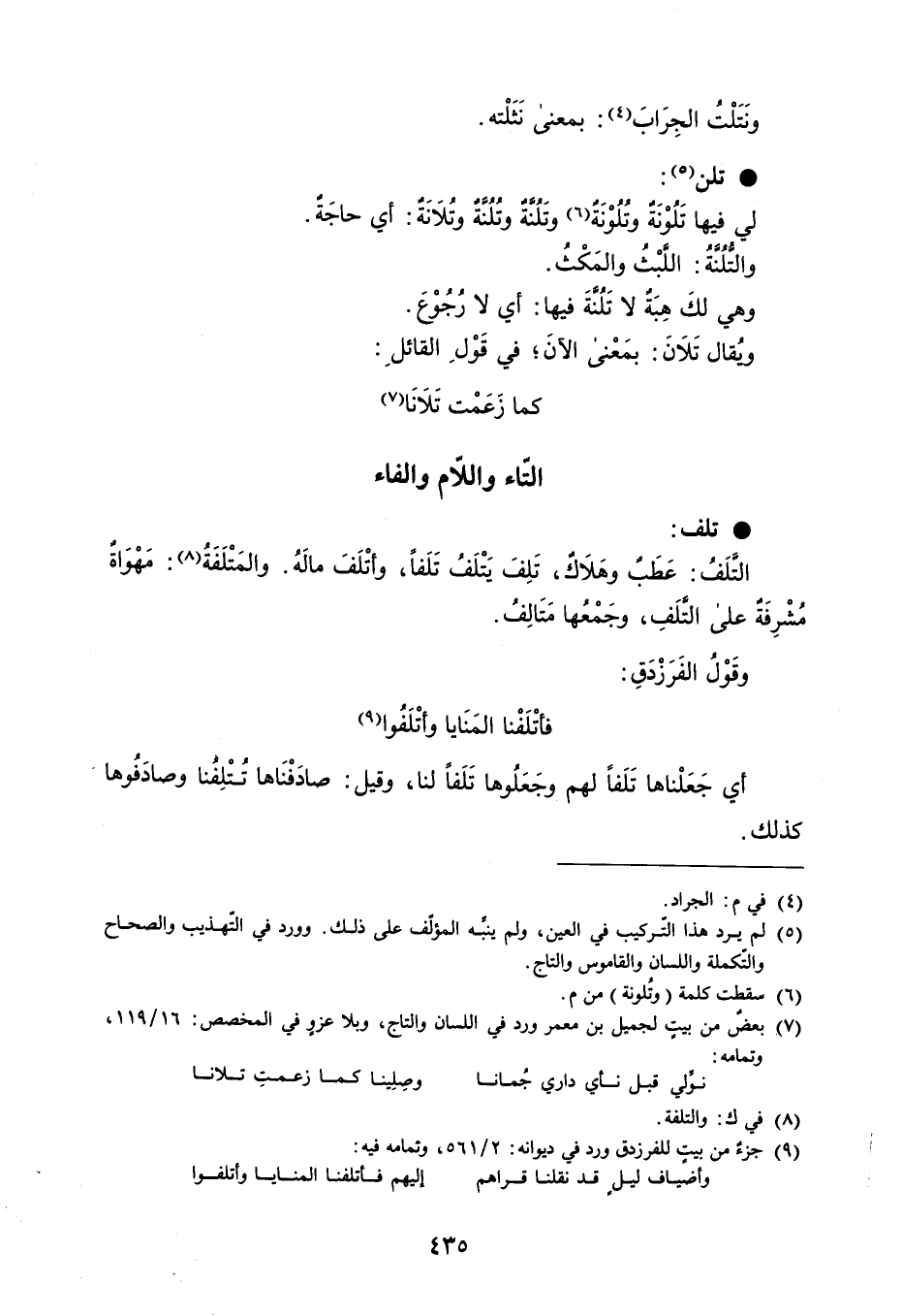 ونَتَلْتُ الجِرَابَ : بمعنى نَثَلْته . تلن لي فيها تَلُوْنَةٌ وتُلُوْنَةٌ وتَلنَّةٌ وتُلُنةٌ وتُلانَةٌ : أي حاجَةٌ . والتُّلُنَّةُ : التَبْثُ والمَكْثُ . وهي لكَ هِبَةٌ لاتَلُنَّةَ فيها : أي لارُجُوْعَ . ويُقال تَلَانَ : بمَعْنى الأنَ ؛ في قَوْلِ القائلِ : كما زَعَمْت تَلَانَا