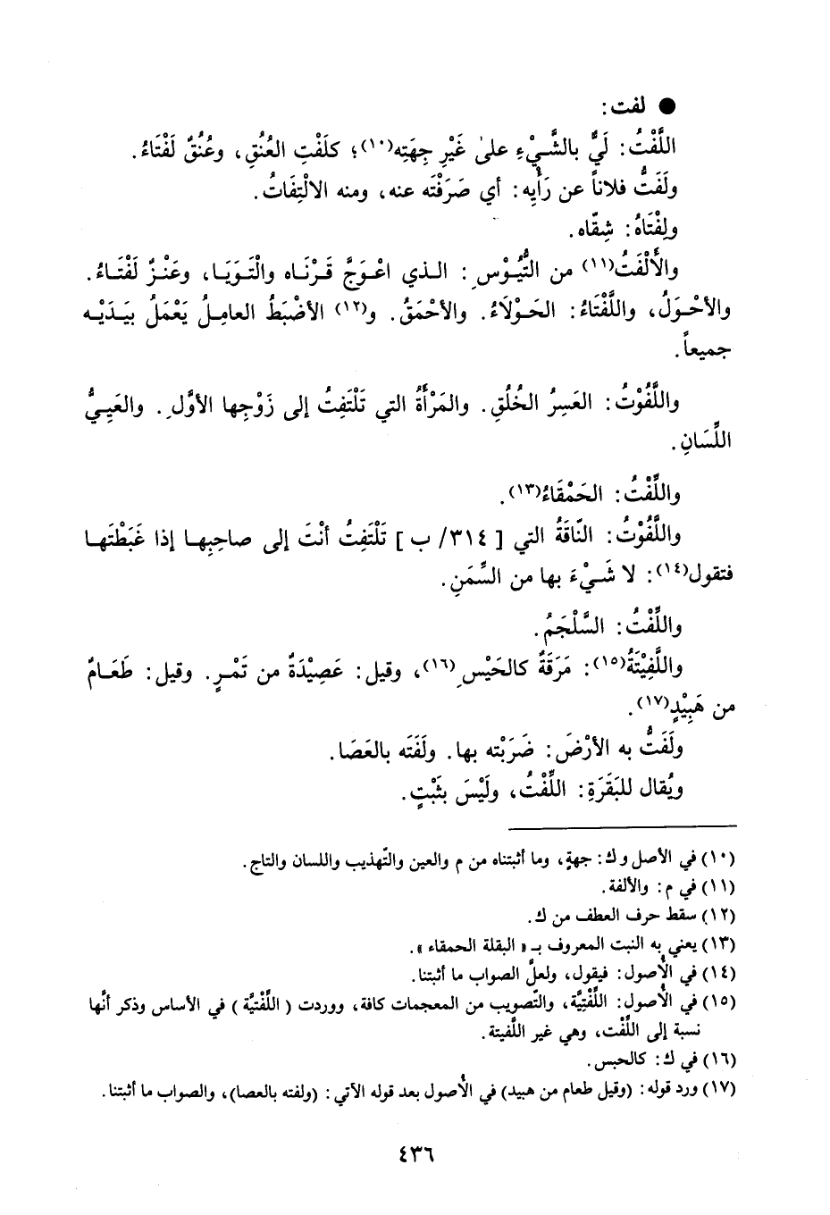 لفت التَفْتُ : لَي بالشَّيْءِ على غَيْرِ جِهَتِه ؛ كلَفْتِ العُنقِ ، وعُنُقٌ لَفْتَاء . ولَفَتُّ فلاناً عن رَأيِه : أي صَرَفْتَه عنه ، ومنه الالْتِفَات . ولفْتَاهُ : شِقّاه . والألْفَتُ من التُّيوْسِ : الذي اعْوَج قَرْنَاه والْتَوَيا ، وعَنْز لَفْتَاءُ . والأحْوَلُ ، والتَفْتَاءُ : الحَوْلاءُ . والأحْمَقُ . والأضْبَطُ العامِلُ يَعْمَلُ بيَدَيْه جميعاً . واللَّفُوْتُ : العَسِرُ الخُلُقِ . والمَرْأةُ التي تَلْتَفِتُ إلى زَوْجِها الأوَّلِ . والعَيِيُّ اللسان . واللِّفْتُ : الحَمْقَاءُ . واللَفُوْتُ : النّاقَةُ التي تَلْتَفِتُ أنْتَ إلى صاحِبِها إذا غَبَطْتَها فتقول : لاشَيْءَ بها من السِّمَنِ . واللَفْتُ : السَّلْجَمُ . واللَّفِيْتَةُ : مَرَقَةٌ كالحَيْسِ ، وقيل : عَصِيْدَةٌ من تَمْرٍ . وقيل : طَعَامٌ من هَبِيْدٍ . ولَفَت به الأرْضَ : ضَرَبْته بها . ولَفَتَه بالعَصَا . ويُقال للبَقَرَةِ : اللفْتُ ، ولَيْسَ بثَبْتٍ .