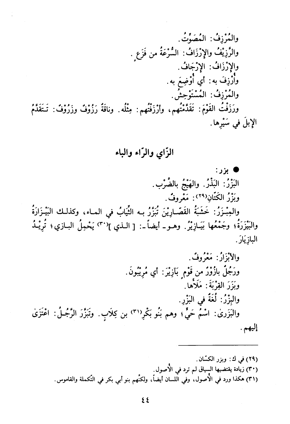 بزر البَزْرُ : البَذْرُ . والهَيْجُ بالضَّرْب . وبَزْرُ الكَتّانِ : مَعْروف . والمِبْزَرُ : خَشَبَةُ القَصارِيْنَ تُبَزَرُ به الثِّيَابُ في الماء ، وكذلك البَيْزَارَةُ والبَيْزَرَةُ ؛ وجَمْعُها بَيَازِيرُ . وهو - أيضاً - : الذي يَحْمِلُ البازي ؛ تُرِيْدُ البازِيَارَ . والأ بْزَارُ : مَعْرُوفٌ . ورَجلٌ بازُوْرٌ من قَوْمٍ بَآزِيْرَ : أي مُرِيْبُونَ . وبَزَرَ القِرْبَةَ : مَلأها . والبِزْرُ : لُغَةٌ في البَزْرِ . والبَزَرى : اسْمُ حَي ؛ وهم بَنُو بَكْرِ بن كِلاَبٍ . وتَبَزَرَ الرَّجُلُ : اعْتَزَى إليهم .