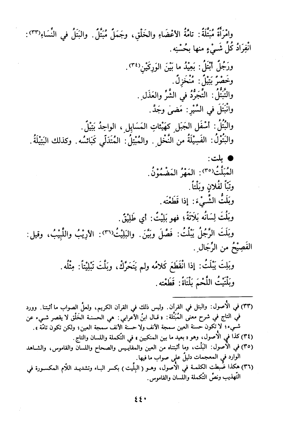 وامْرأة مُبَتَلَةٌ : تامَّةُ الأعْضَاءِ والخَلْقِ ، وجَمَلٌ مُبَتَلٌ . والبَتَلُ في النِّسَاءِ : انْفِرَادُ كُلِّ شَيْءٍ منها بحُسْنِه . ورَجُلٌ أبْتَلُ : بَعِيْد ما بَيْنَ الوَرِكَيْنِ . وخَصْرٌ بَتِيْلٌ : مُنْخَزِلٌ . والتَبَتُّلُ : التَّجَرُّدُ في الشَرِّ والعَذَلِ . وانْبَتَلَ في السَّيْرِ : مَضى وجَدَّ . والبُتُلُ : أسْفَل الجَبَلِ كهَيْئاتِ المَسَايِلِ ، الواحِدُ بَتِيْلٌ . والبَتُوْلُ : الفَسِيْلَة من النَّخْلِ . والمُبْتِلُ : المُتَدَلّي كَبَائسُه . وكذلك البَتِيْلَةُ . بلت المُبَنَتُ : المَهْرْ المَضْمُوْنُ . وتَبّاً لفلانٍ وبَلْتاً . وبَلَتُ الشيْءَ : إذا قَطَعْتَه . وبَلتَ لِسَانُه بَلاتَةً ؛ فهو بَلِيْتٌ : أي طَلِيْقٌ . وبَلَتَ الرَّجُلُ يَبْلُتُ : فصضَلَ وبَيَّنَ . والَبلِيتبُ : الأرِيْب واللَبِيْبُ ، وقيل : الفَصِيْحُ من الرِّجَالِ . وبَلِتَ يَبْلَتُ : إذا انْقَطَعَ كَلامُه ولم يَتَحَرَّكْ ، وبَلَتَ تَبْلِيْتاً : مِثْلُه . وبَلْتَيْتُ اللحْمَ بَلْتَاةً : قَطَعْته .