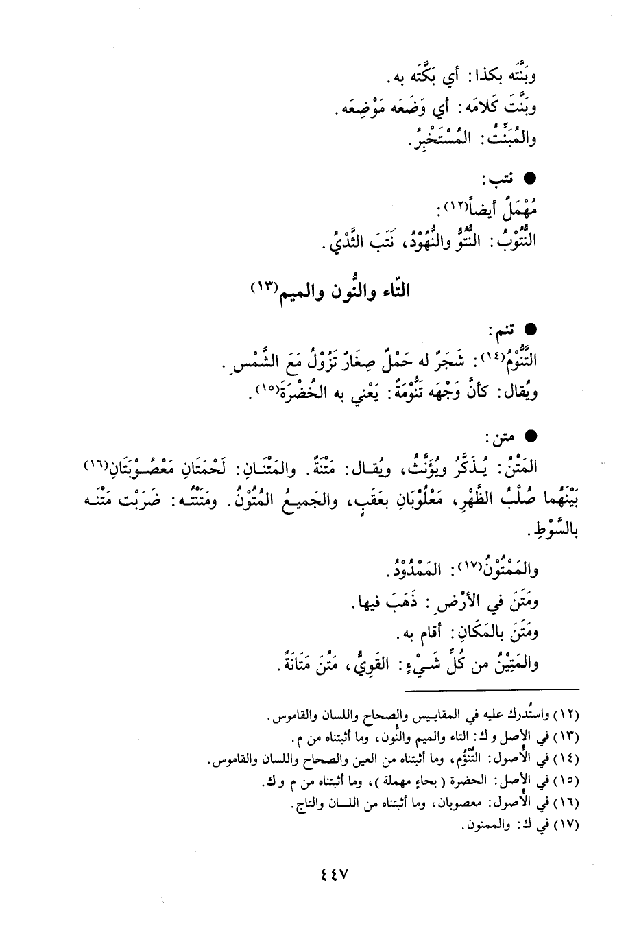 تنم التَنُّوْمُ : شَجَرٌ له حَمْل صِغَارٌ تَزُوْلُ مَعَ الشَّمْسِ . وُيقال : كأنَّ وَجْهَه تَنُّوْمَةٌ : يَعْني به الخُضْرَة . متن المَتْنُ : يُذَكَرُ وُيؤَنَثُ ، ويُقال : مَتْنَة . والمَتْنَانِ : لَحْمَتَانِ مَعْصُوْبَتَانِ بَيْنَهُما صُلْبُ الظَهْرِ ، مَعْلُوْبَانِ بعَقَب ، والجَميعُ المُتُوْن . ومَتَنْتُه : ضَرَبْت مَتْنَه بالسَّوْطِ . والمَمْتُوْنُ : المَمْدُوْدُ . ومَتَنَ في الأرْضِ : ذَهَبَ فيها . ومَتَنَ بالمَكَانِ : أقام به . والمَتِيْنُ من كُلِّ شَيْءٍ : القَوِيُّ ، مَتُنَ مَتَانَةً .