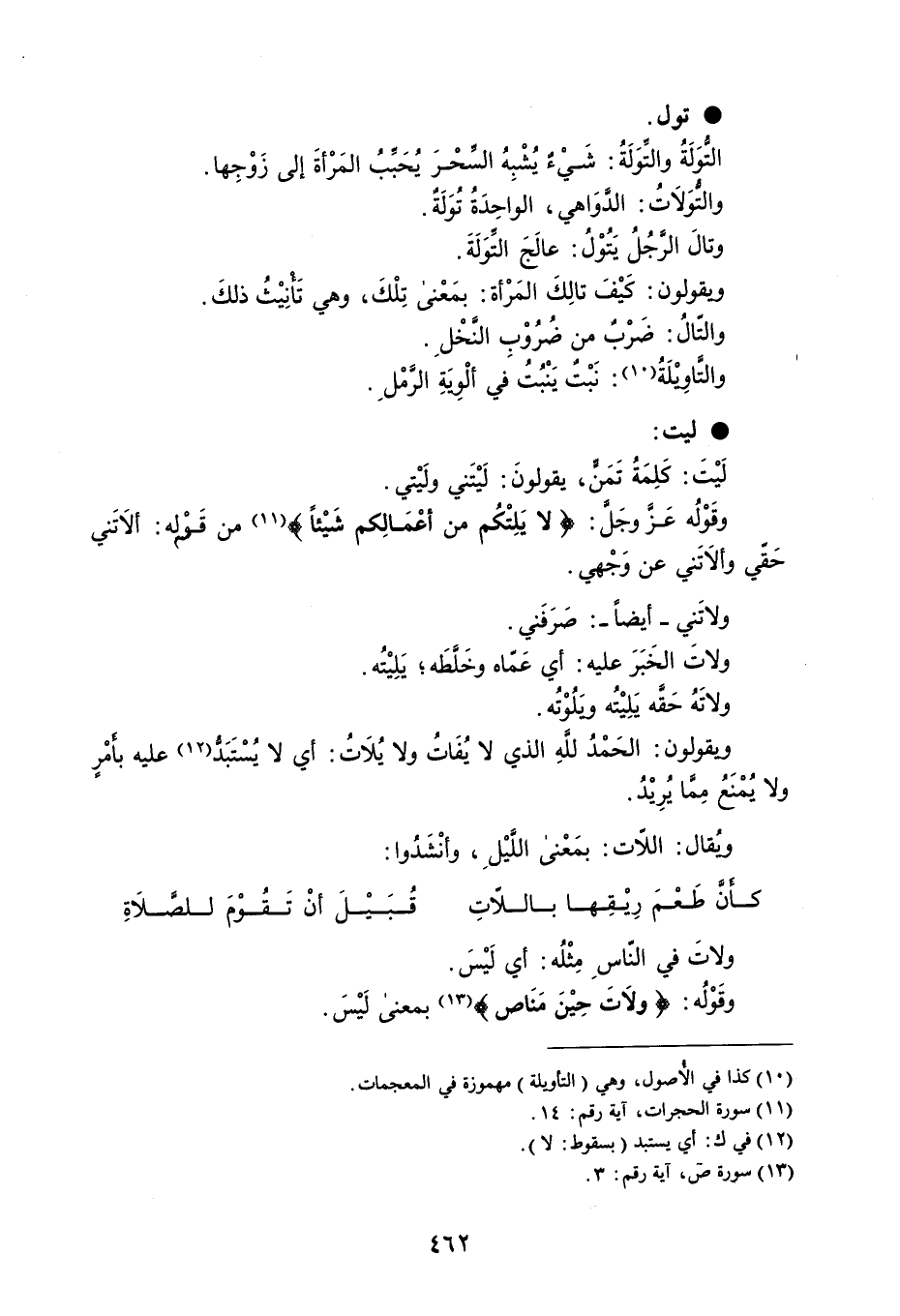 تول : . التُّوَلَةُ والتِّوَلَةُ : شَيْء يُشْبِهُ السحْرَ يُحَبِّبُ المَرْأةَ إلى زَوْجِها . والتُّوَلاتُ : ا لدَّوَاهي ، الواحِدَةُ تُوَلَةٌ . وتالَ الرجلُ يَتُوْلُ : عالَجَ التَوَلَةَ . ويقولون : كَيْفَ تالِكَ المَرْأة : بمَعْنى تِلْكَ ، وهي تَأنِيْثُ ذلكَ . والتَالُ : ضَرْبٌ من ضرُوْب النَخْلِ . والتَّاويلَةُ : نَبْتٌ يَنْبُتُ فَي ألْوِيَةِ الرَّمْلِ . ليت لَيْتَ : كَلِمَةُ تَمَن ، يقولونَ : لَيْتَني ولَيْتي . وقَوْلُه عَزَوجَلَّ : ' لا يَلِتْكُم من أعْمَالِكم شَيْئاً ' من قوله : ألاتَني حَقي وألاَتَني عن وَجْهي . ولاتَني - أيضاً - : صَرَفَني . ولاتَ الخَبَرَ عليه : أي عَمّاه وخَلَّطَه ؛ يَلِيْتُه . ولاتَهُ حَقه يَلِيْتُه وَيلُوْتُه . ويقولون : الحَمْدُ للَّهِ الذي لا يُفَاتُ ولا يُلَاتُ : أي لا يُسْتَبَدُّ عليه بأمر ولا يُمْنَعُ مِما يُرِيْدُ . وُيقال : اللآت : بمَعْنى اللَيْلِ ، وأنْشَدُوا : كأن طَعْمَ رِيْقِها باللاّتِ . . . قُبَيْلَ أنْ تَقُوْمَ للصلاَةِ ولاتَ في النّاسِ مِثْلُه : أي لَيْسَ . وقَوْلُه : ' ولاَتَ حِيْنَ مَنَاص ' بمعنى لَيْسَ .